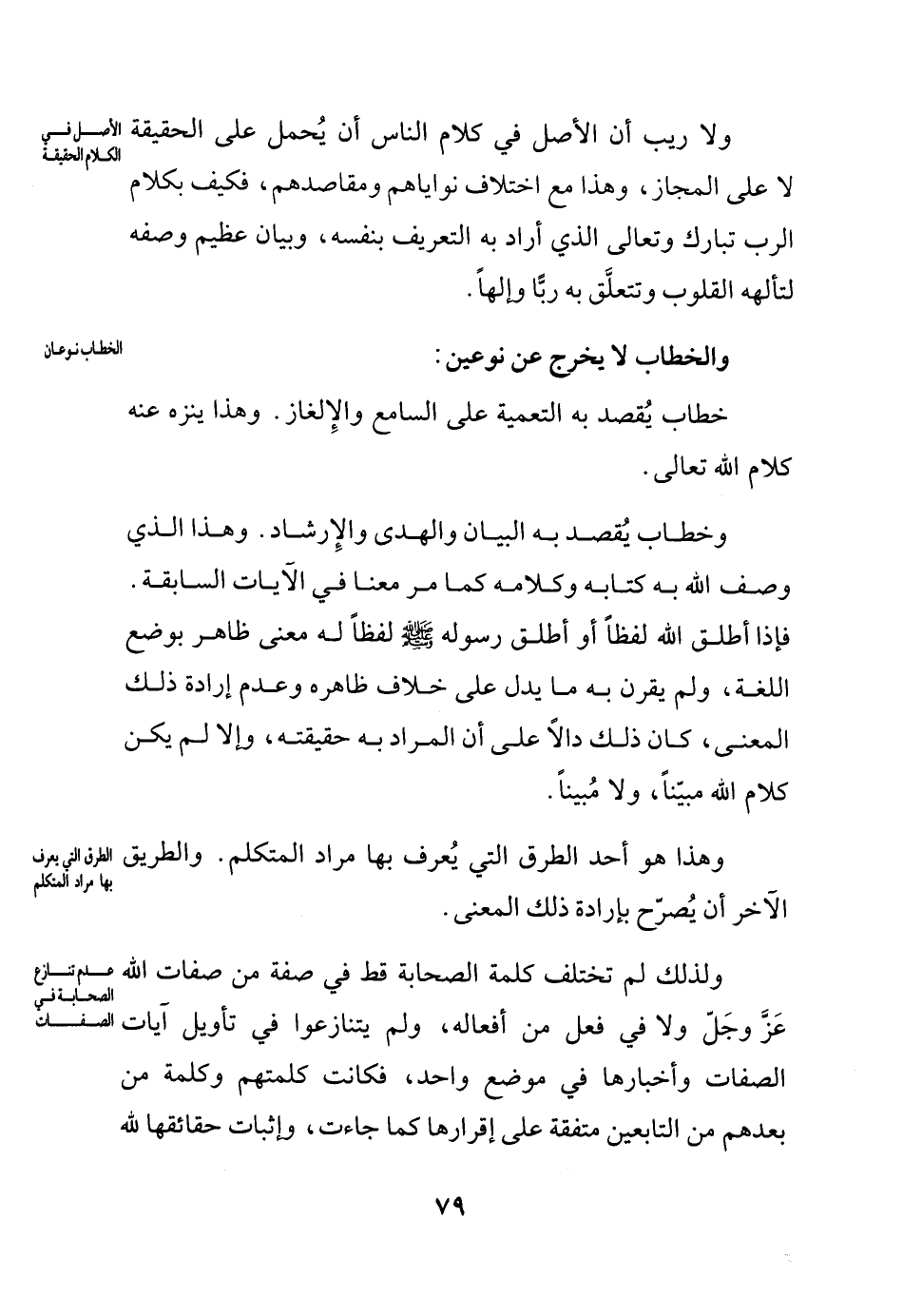 وخطاب يُقصد به البيان والهدى والإرشاد. وهذا الذي وصف الله به كتابه وكلامه كما مر معنا في الآيات السابقة. فإذا أطلق الله لفظاً أو أطلق رسوله - صلى الله عليه وسلم - لفظاً له معنى ظاهر بوضع اللغة، ولم يقرن به ما يدل على خلاف ظاهره وعدم إرادة ذلك المعنى، كان ذلك دالاً على أن المراد به حقيقته، وإلا لم يكن كلام الله مبيّناً، ولا مُبيناً.