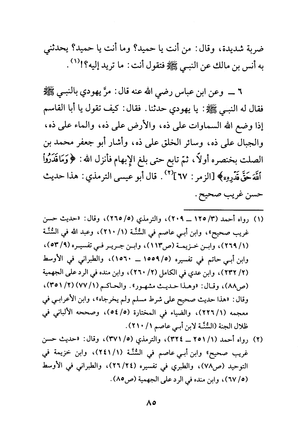 (¬2) رواه أحمد (1/ 251،324) والترمذي (5/ 371) وقال: (حديث حسن غريب صحيح) وابن أبي عاصم في السنة (1/ 241) وابن خزيمة في التوحيد (ص78) والطبري في تفسيره (24/ 26) والطبراني في الأوسط (5/ 67) وابن منده في الرد على الجهمية (ص85).
