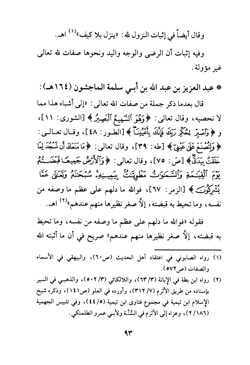 قال بعدما ذكر جملة من صفات الله تعالى: (إلى أشباه هذا مما لا نحصيه، وقال تعالى {وهو السميع البصير} الشورى11، و {اصبر لحكم ربك فإنك بأعيننا} الطور 48، وقال تعالى {ولتصنع على عيني} طه 39، وقال تعالى {ما منعك أن تسجد لما خلقت بيدي} ص75، وقال تعالى {والأرض جميعا قبضته يوم القيامة والسموات مطويات بيمينه سبحانه وتعالى عما يشركون} الزمر67، فوالله ما دلهم على عظم ما وصفه من نفسه، وما تحيط به قبضته، إلا صغر نظيرها منهم عندهم) (¬2) اهـ.