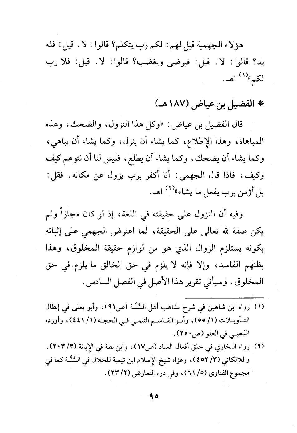 قال الفضيل بن عياض: (وكل هذا النزول، والضحك، وهذه المباهاة، وهذا الإطلاع، كما يشاء أن ينزل، وكما يشاء أن يباهي، وكما يشاء أن يضحك، وكما يشاء أن يطلع، فليس لنا أن نتوهم كيف وكيف، فاذا قال الجهمى: أنا أكفر برب يزول عن مكانه. فقل: بل أومن برب يفعل ما يشاء) (¬2) اهـ.