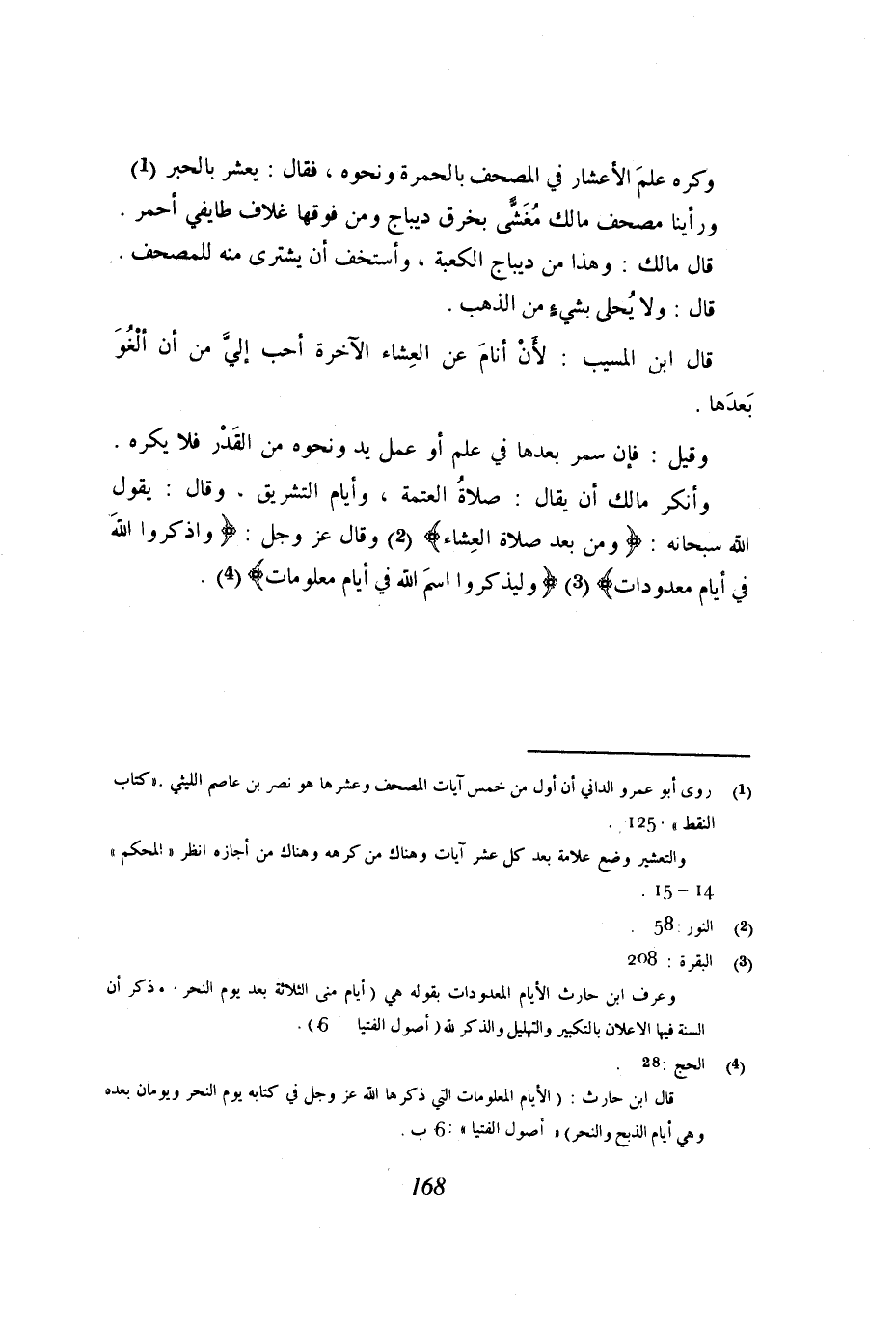 وكره علم الأعشار في المصحف بالحمرة ونحوه، فقال: يعشر بالحبر، ورأينا مصحف مالك مُغَشى بخرق ديباج ومن فوقها غلاف طايفي أحمر.