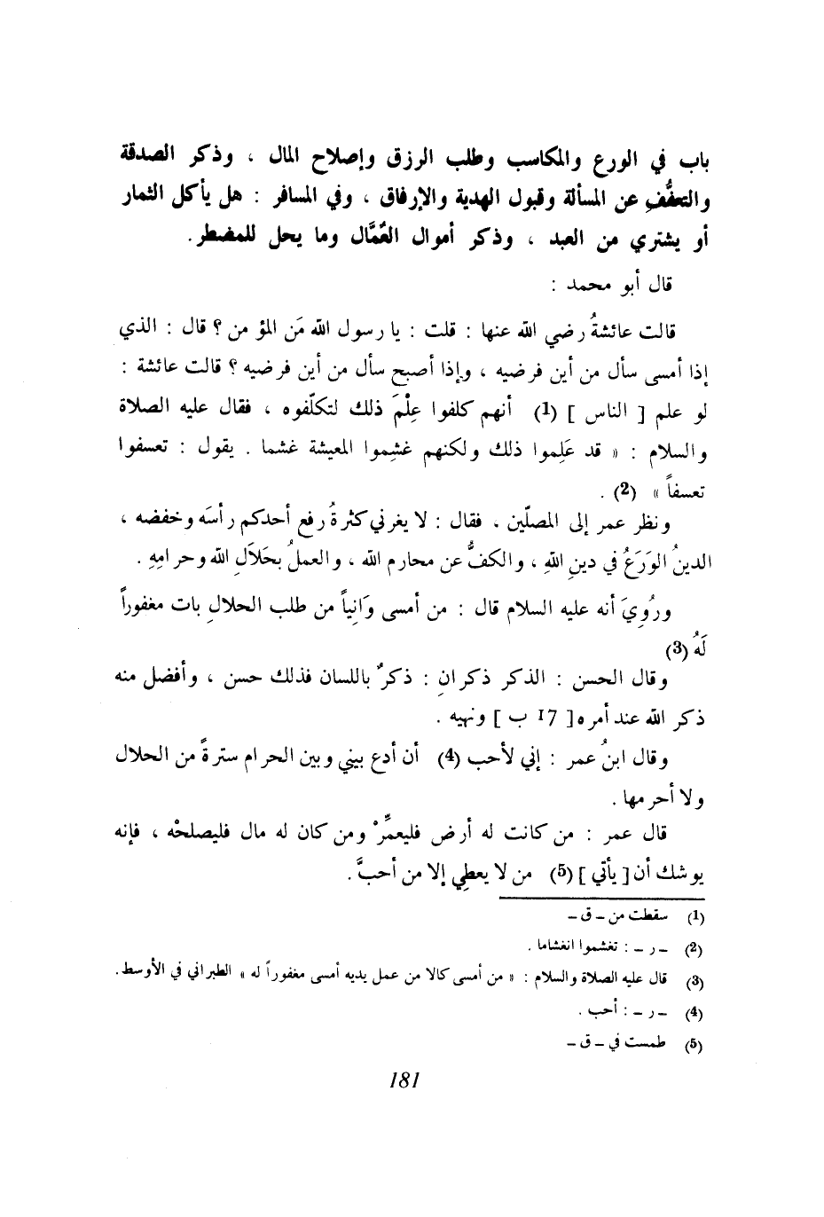 باب في الورع والمكاسب وطلب الرزق وإصلاح المال، وذكر الصدقة والتعفف عن المسألة وقبول الهدية والإرفاق، وفي المسافر: هل يأكل الثمار أو يشتري من العبد، وذكر أموال العمال، وما يحل للمضطر.