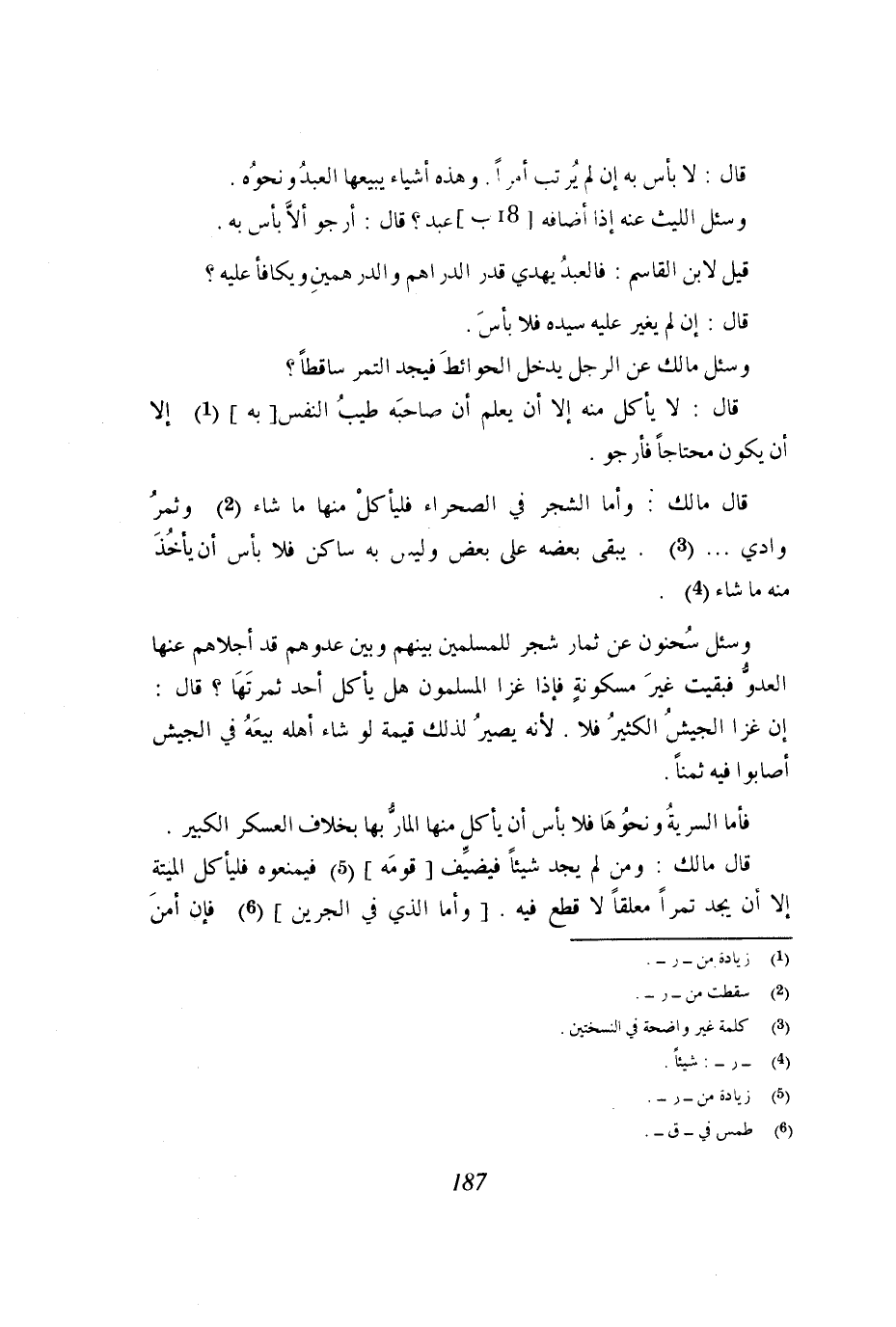 وسئل سحنون عن ثمار شجر للمسلمين بينهم وبين عدوهم قد أجلاهم عنها العدو فبقيت غير مسكونة فإذا غزا المسلمون هل يأكل أحد ثمرتها؟ قال: إن غزا الجيش الكثير فلا، لأنه يصير لذلك قيمة لو شاء أهله بيعه في الجيش أصابوا فيه ثمنًا.