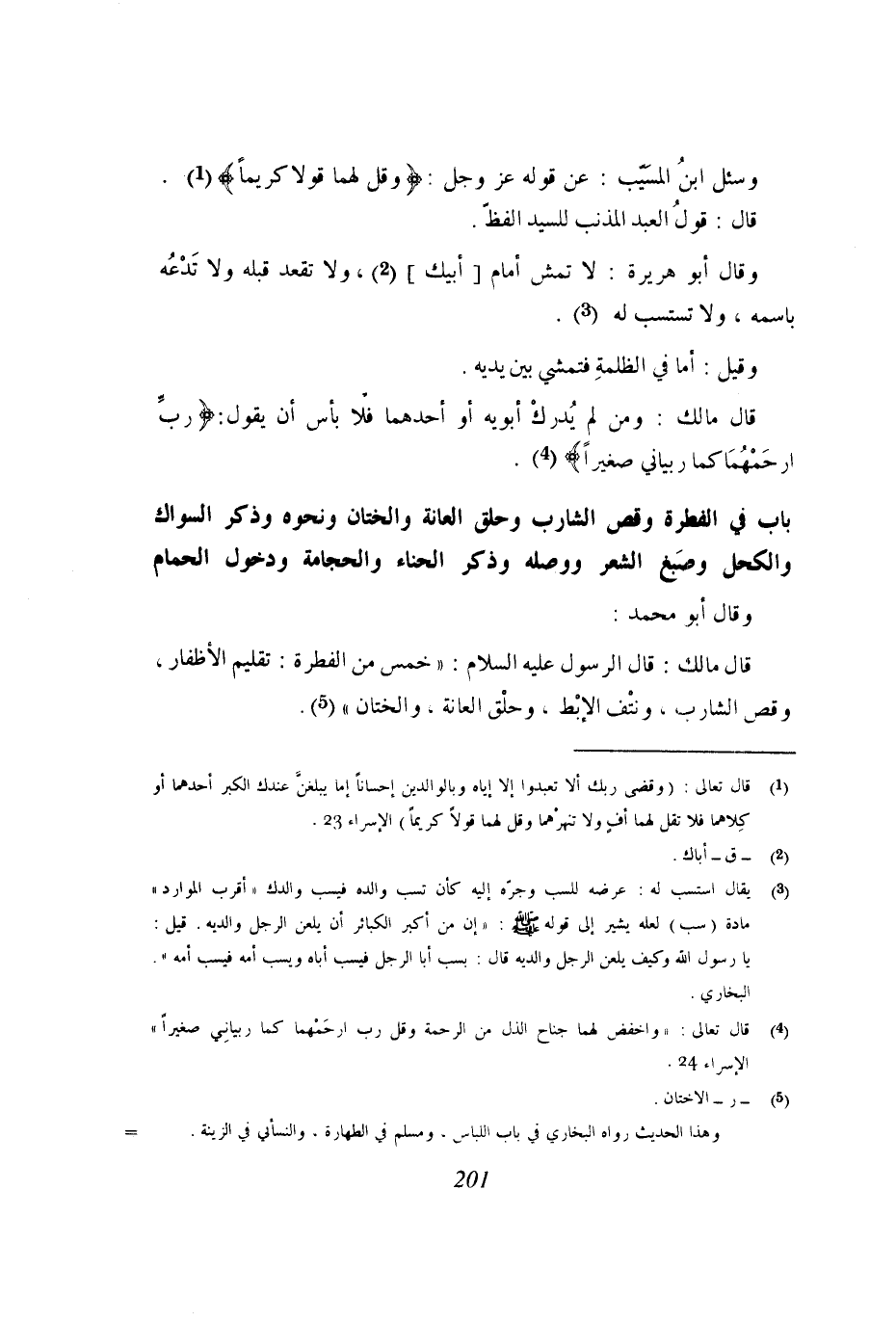قال مالك: قال الرسول عليه الصلاة والسلام: (خمس من الفطرة: تقليم الأظفار، وقص الشارب، ونتف الإبط، وحلق العانة، والختان).