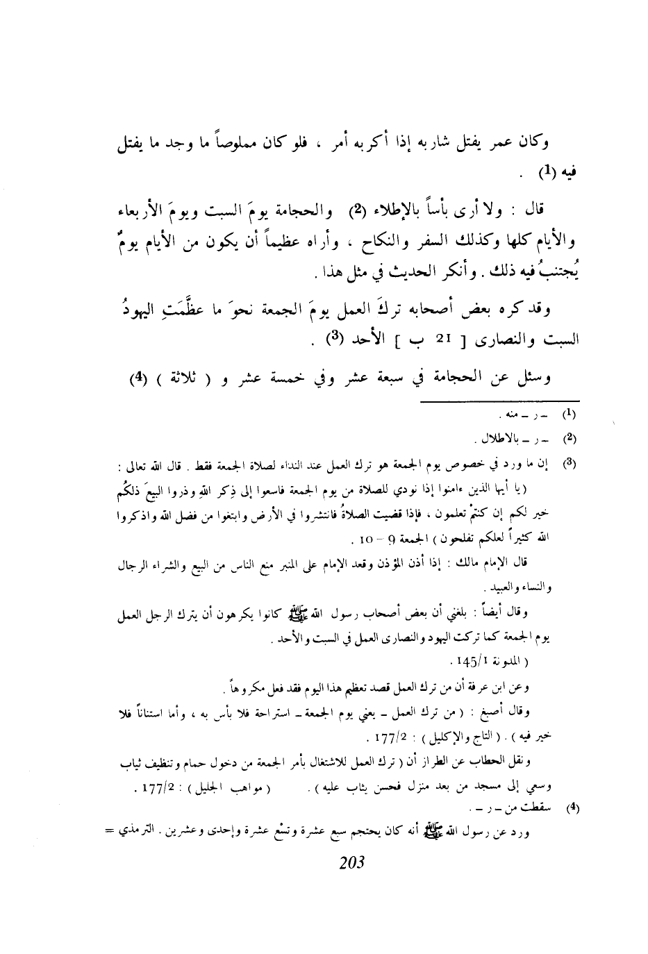 وقد كره بعض أصحابه ترك العمل يوم الجمعة نحو ما عظمت اليهود السبت والنصارى [21 ب] الأحد.