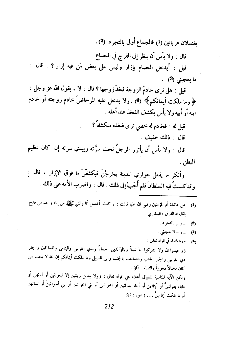 قيل: هل ترى خادم الزوجة فخذ زوجها؟ قال: لا، يقول الله عز وجل: {وَمَا مَلَكَتْ أَيْمَانُكُمْ} [النساء: 6]، ولا يدخل عليه المرحاض خادم زوجته أو خادم ابنه أو أبيه ولا بأس بكشف الفخذ عند أهله.