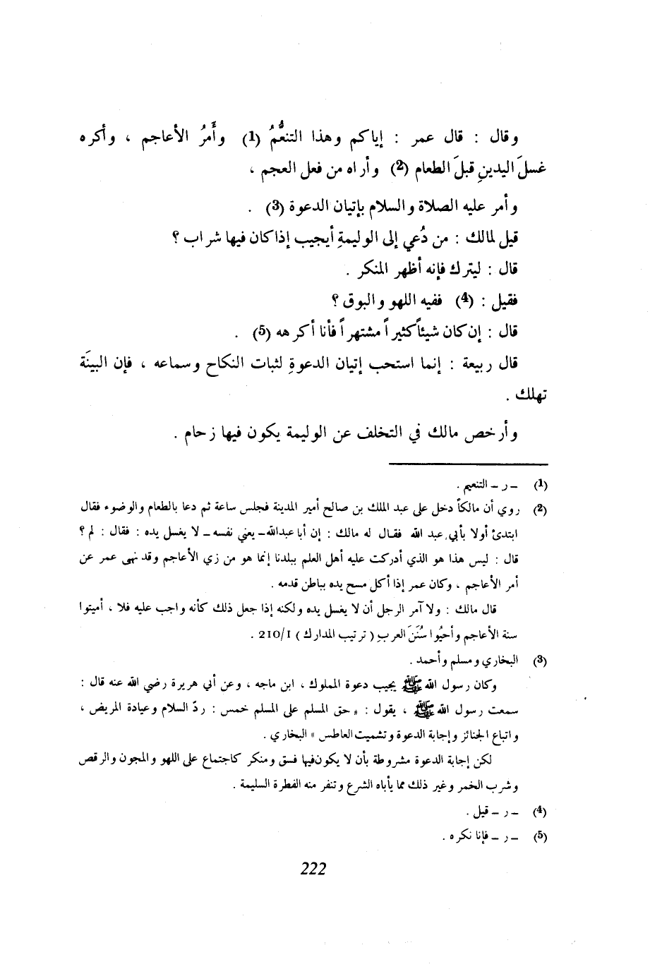 وقال: قال عمر: إياكم وهذا التنعم وأمر الأعاجم، وأكره غسل اليدين قبل الطعام وأراه من فعل العجم، وأمر عليه الصلاة والسلام بإتيان الدعوة.