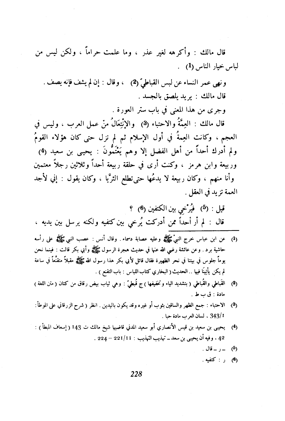 قال مالك: العمة والاحتباء والإنتعال من عمل العرب، وليس في العجم، وكانت العمة في أول الإسلام ثم لم تزل حتى كان هؤلاء القوم ولم أدرك أحدًا من أهل الفضل إلا وهم يعتمون: يحيى بن سعيد، وربيعة وابن هرمز، وكنت أرى في حلقة ربيعة أحدًا وثلاثين رجلاً معتمين وأنا منهم، وكان ربيعة لا يدعها حتى تطلع الثريا، وكان يقول: إني لأجد العمة تزيد في العقل.
