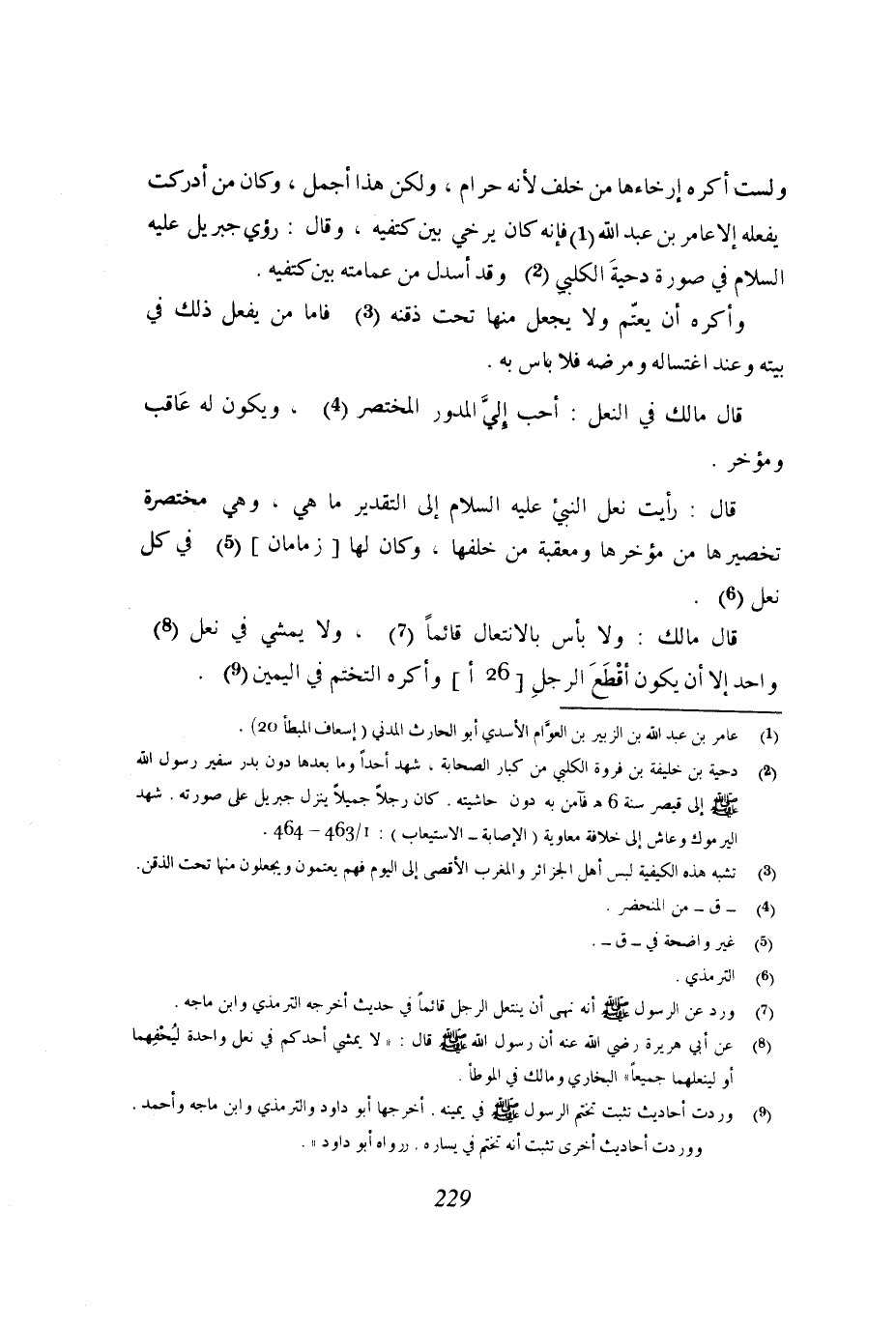 قال مالك: ولا بأس بالانتعال قائمُا، ولا يمشي في نعل واحد إلا أن يكون أقطع الرجل [26 أ] وأكره التختم في اليمين.