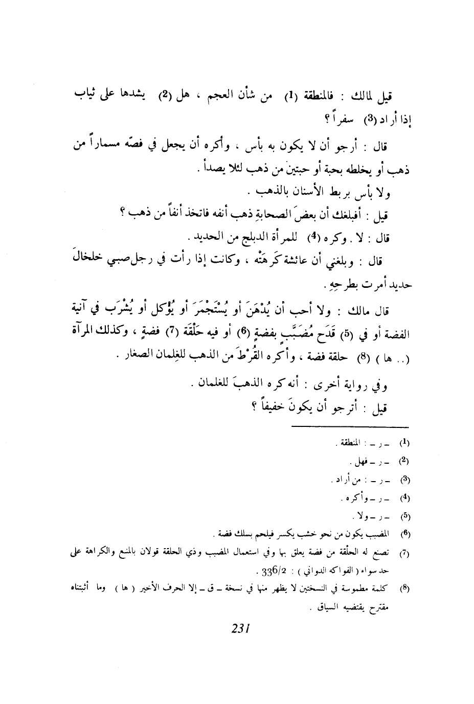 قال مالك: ولا أحب أن يُدهن أو يُستجمر أو يؤكل أو يُشرب في آنية الفضة أو في قدح مضبب بفضة أو فيه حلقة فضة، وكذلك المرآة (... ها) حلقة فضة، وأكره القرط من الذهب للغلمان الصغار.