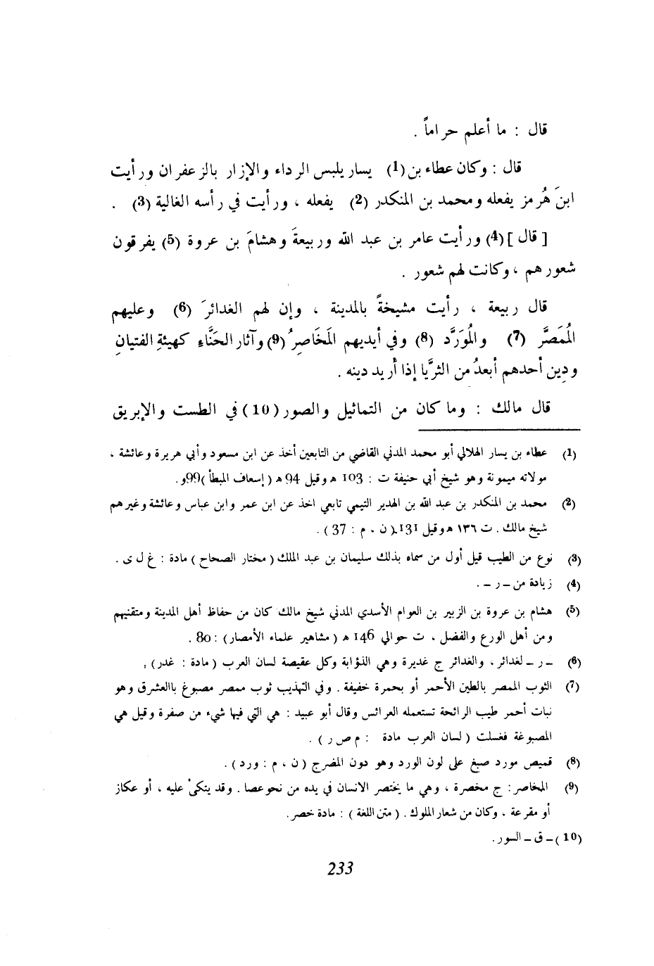 قال: وكان عطاء بن يسار يلبس الرداء والإزار بالزعفران ورأيت ابن هرمز يفعله ومحمد بن المنكدر يفعله، ورأيت في رأسه الغالية.