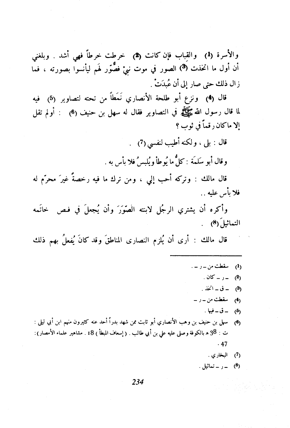 والأسرة والقباب فإن كانت خرطت خرطًا فهي أشد، وبلغني أن أول ما اتخذت الصور في موت نبي فصور لهم ليأنسوا بصورته، فما زال ذلك حتى صار إلى أن عُبدت.