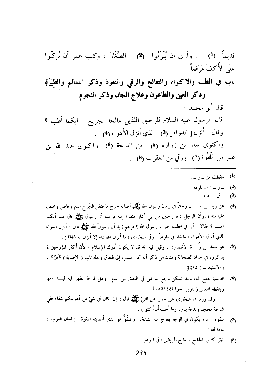باب في الطب والاكتواء والتعالج والرقي والتعوذ وذكر التمائم والطيرة وذكر العين والطاعون وعلاج الجان وذكر النجوم