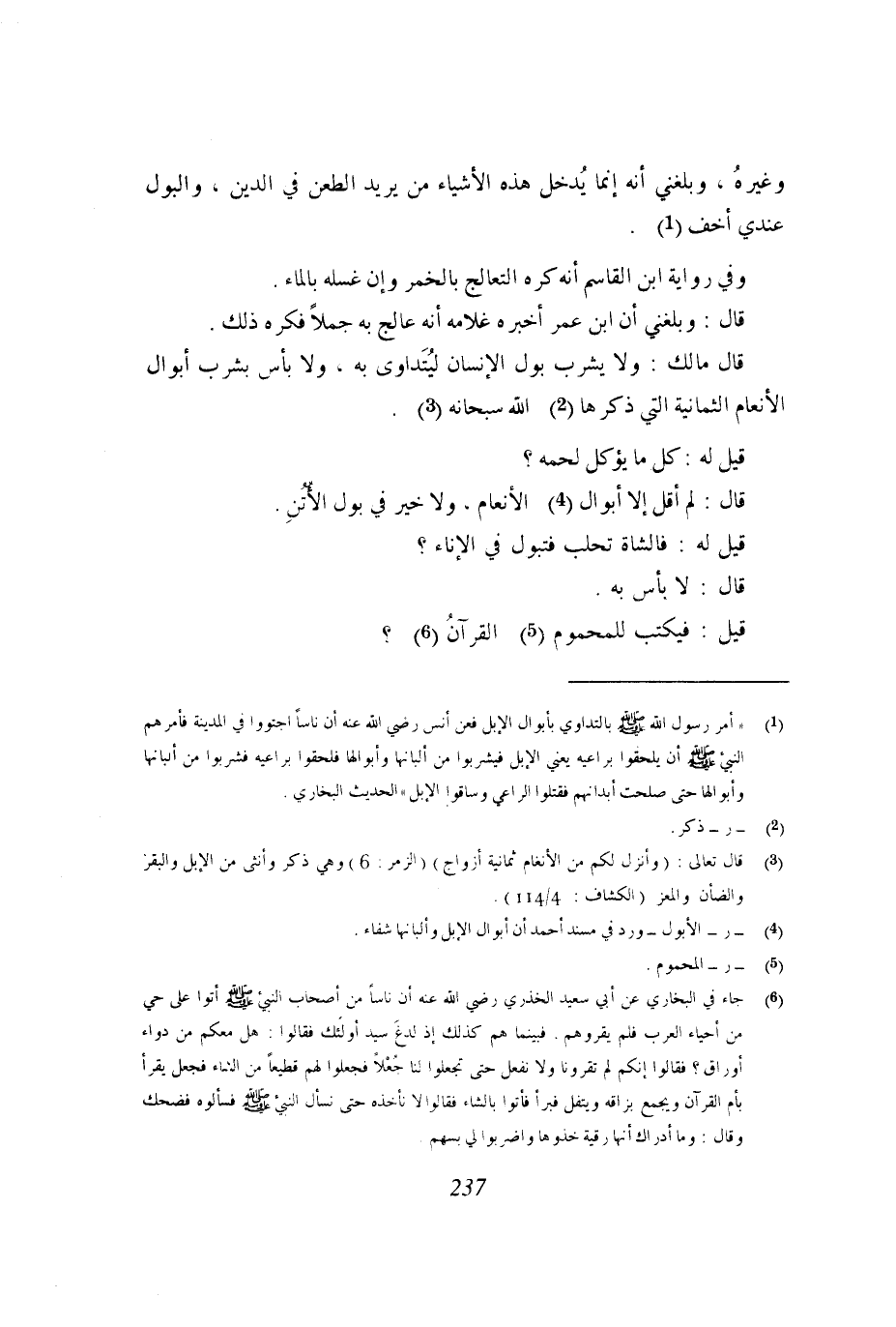 قال مالك: ولا يشرب بول الإنسان ليُتداوى به، ولا بأس بشرب أبوال الأنعام الثمانية التي ذكرها الله سبحانه.