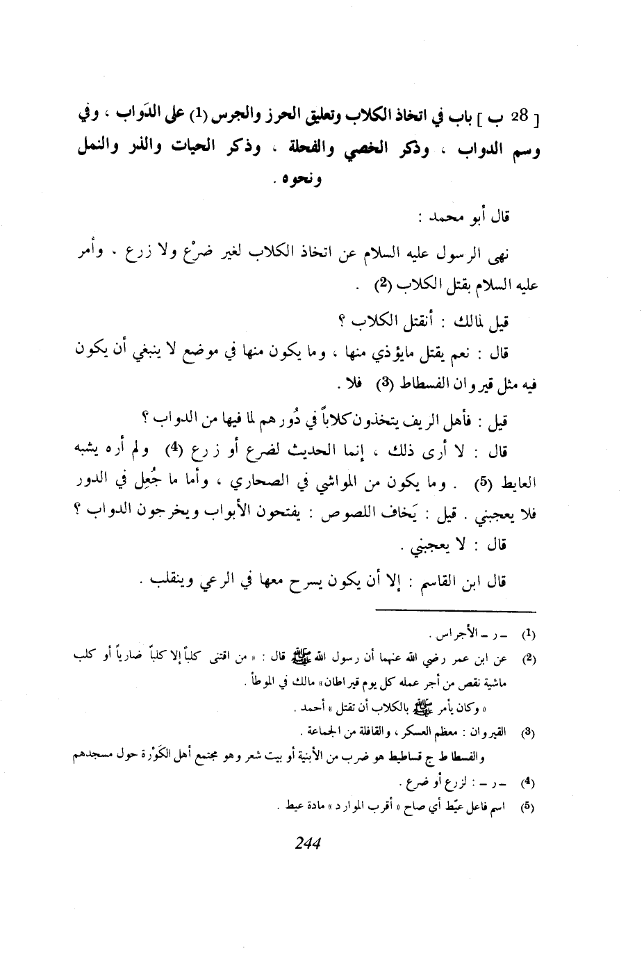 [28 ب] باب في اتخاذ الكلاب وتعليق الحرز والجرس على الدواب، وفي وسم الدواب، وذكر الخصي والفحلة، وذكر الحيات والذر والنمل ونحوه