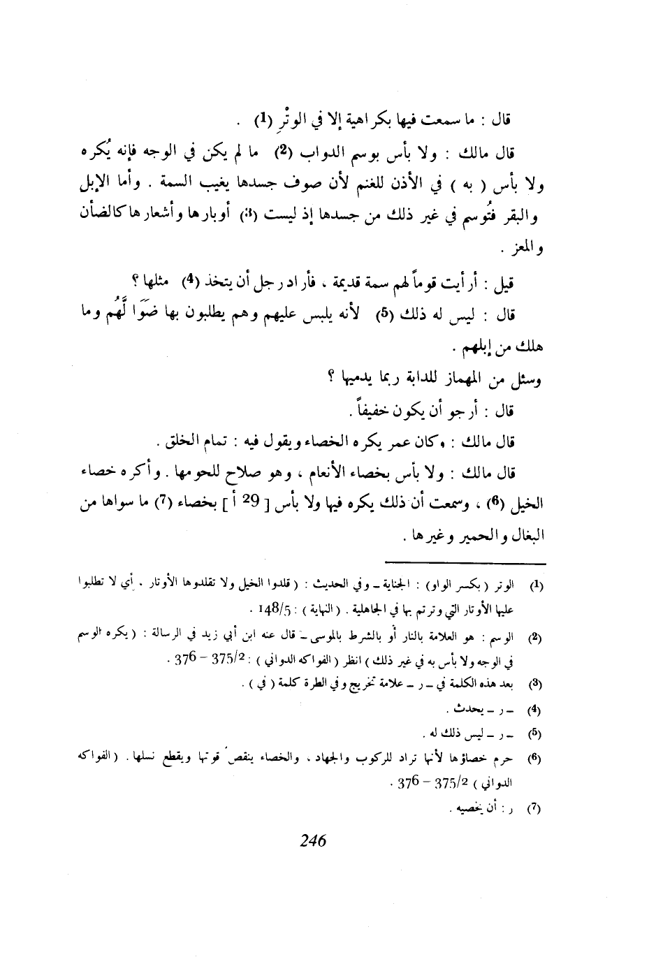 قال مالك: ولا بأس بوسم الدواب، ما لم يكن في الوجه فإنه يُكره ولا بأس (به) في الأذن للغنم لأن صوف جسدها يغيب السمة، وأما الإبل والبقر فتُوسم في غير ذلك من جسدها إذ ليست أوبارها وأشعارها كالضأن والمعز.