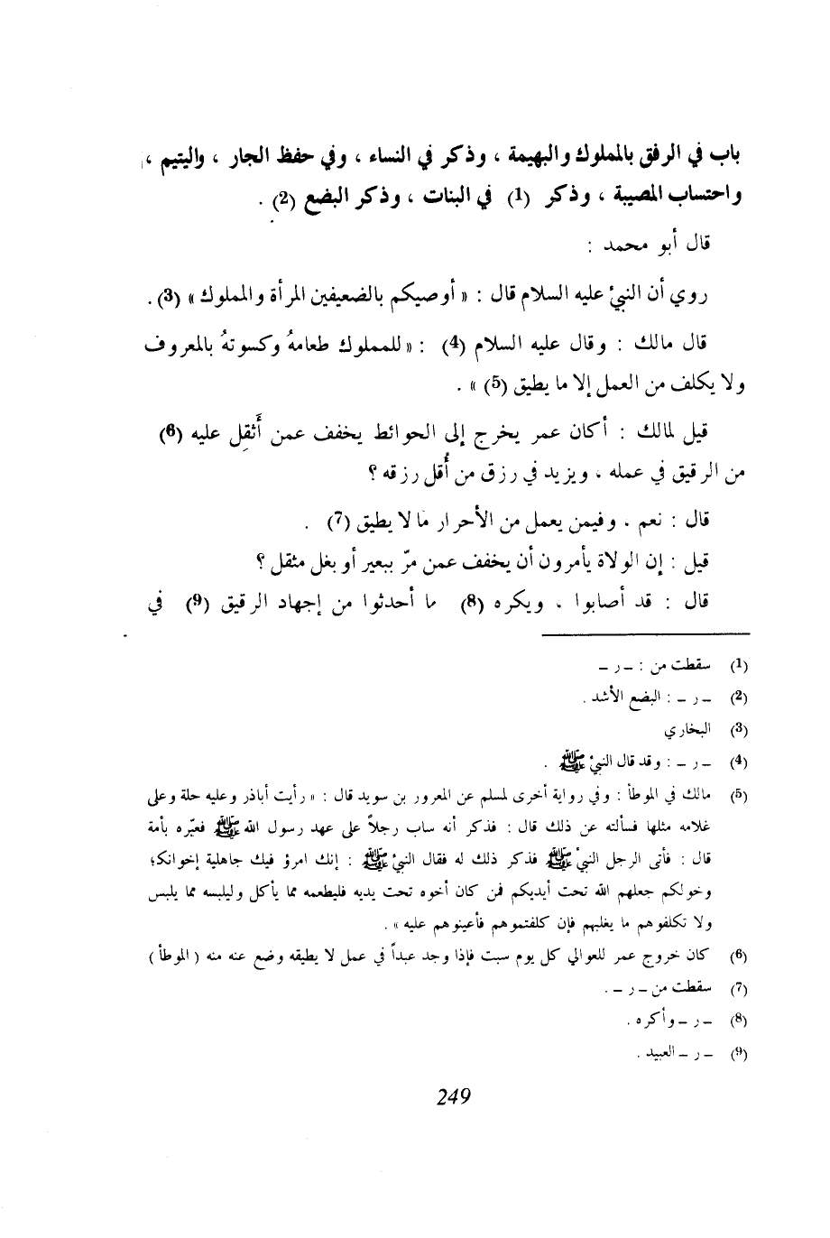 قال مالك: وقال عليه الصلاة والسلام: (للمملوك طعامهُ وكسوته بالمعروف ولا يكلف من العمل إلا ما يطيق).