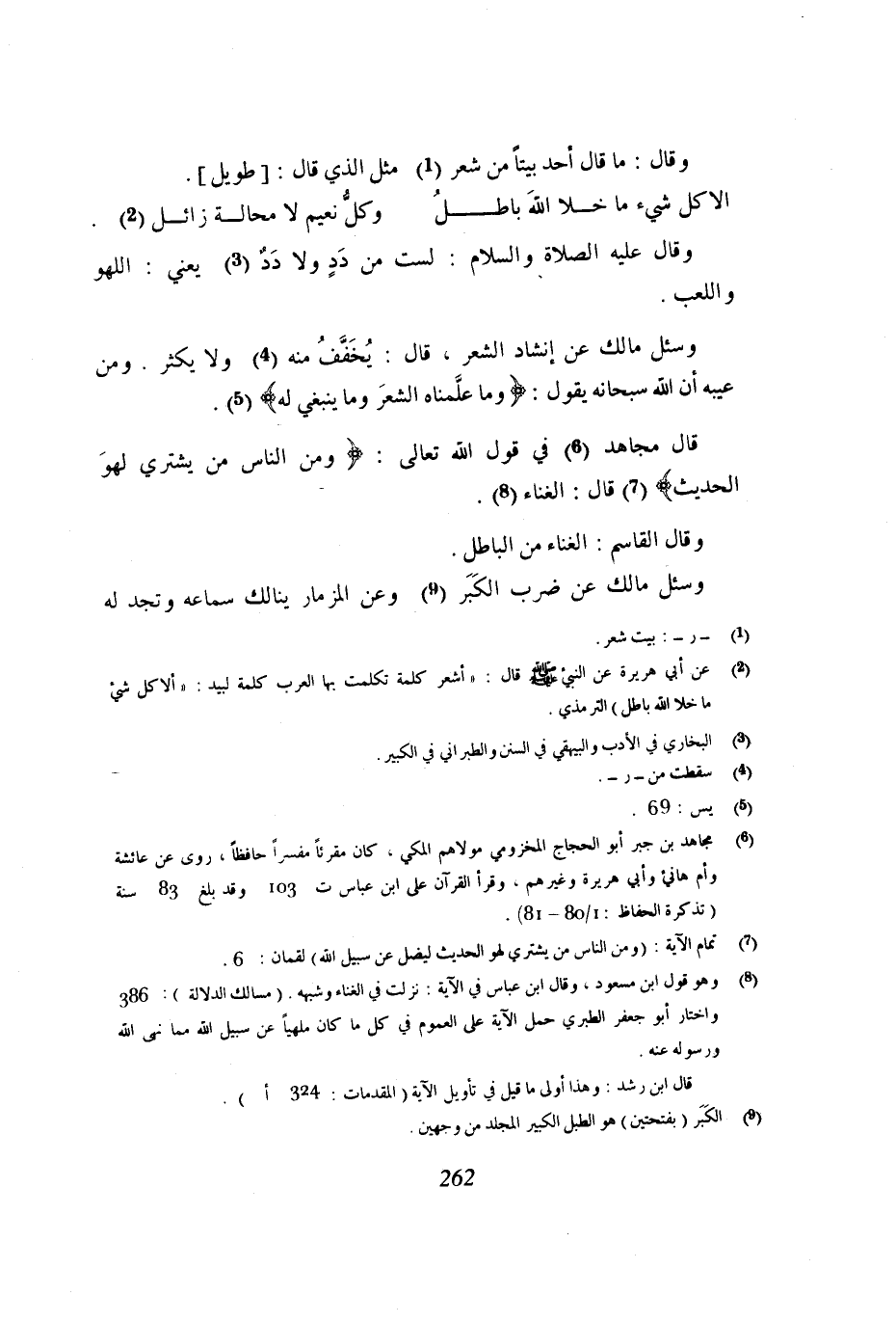 قال مجاهد: في قول الله تعالى: {وَمِنَ النَّاسِ مَن يَشْتَرِي لَهْوَ الْحَدِيثِ} [لقمان: 6]، قال: الغناء.