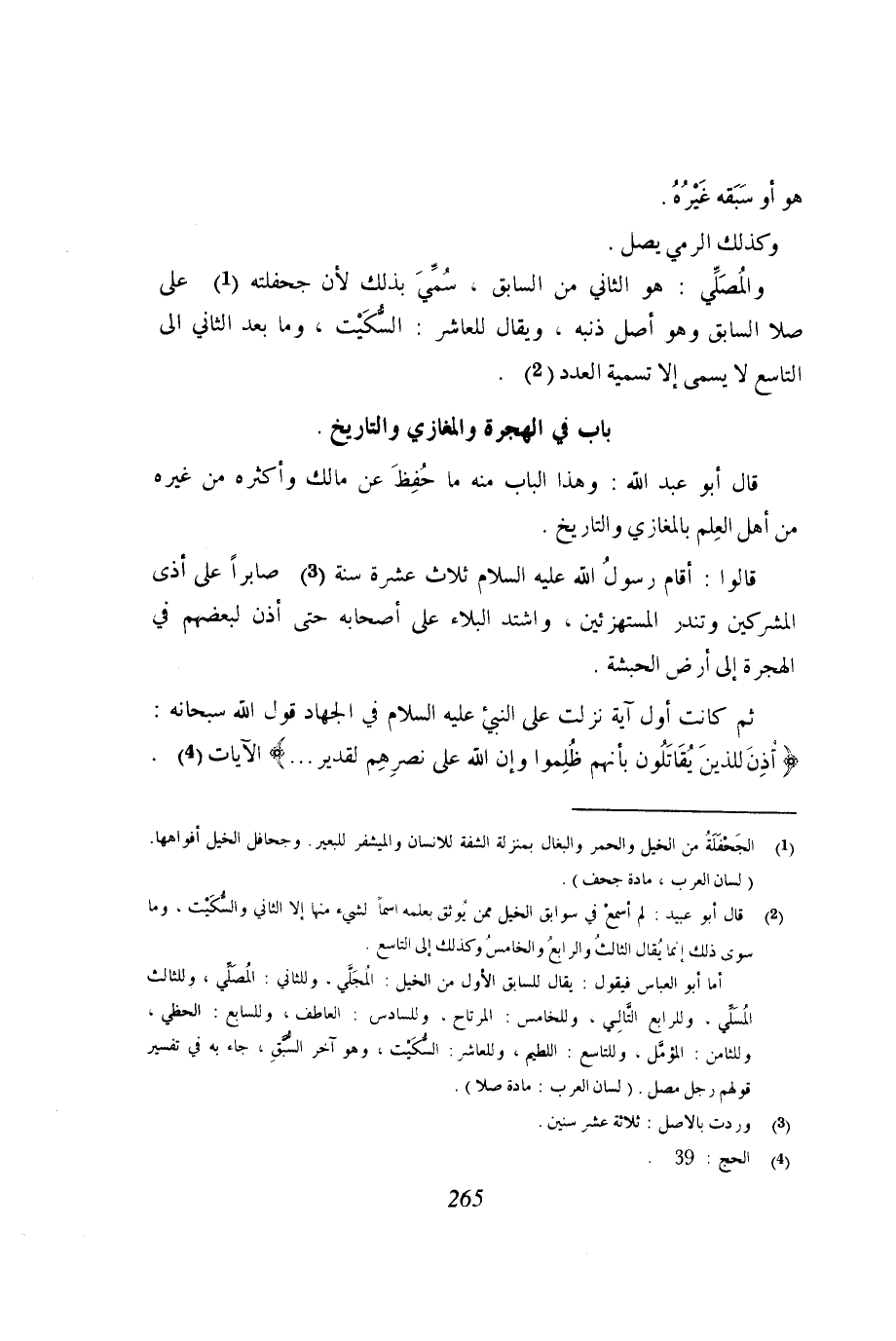 والمصلي: هو الثاني من السابق، سُمي بذلك لأن ححفلته على صلا السابق وهو أصل ذنبه، ويقال للعاشر: السكيت، وما بعد الثاني إلى التاسع لا يسمى إلا تسمية العدد.