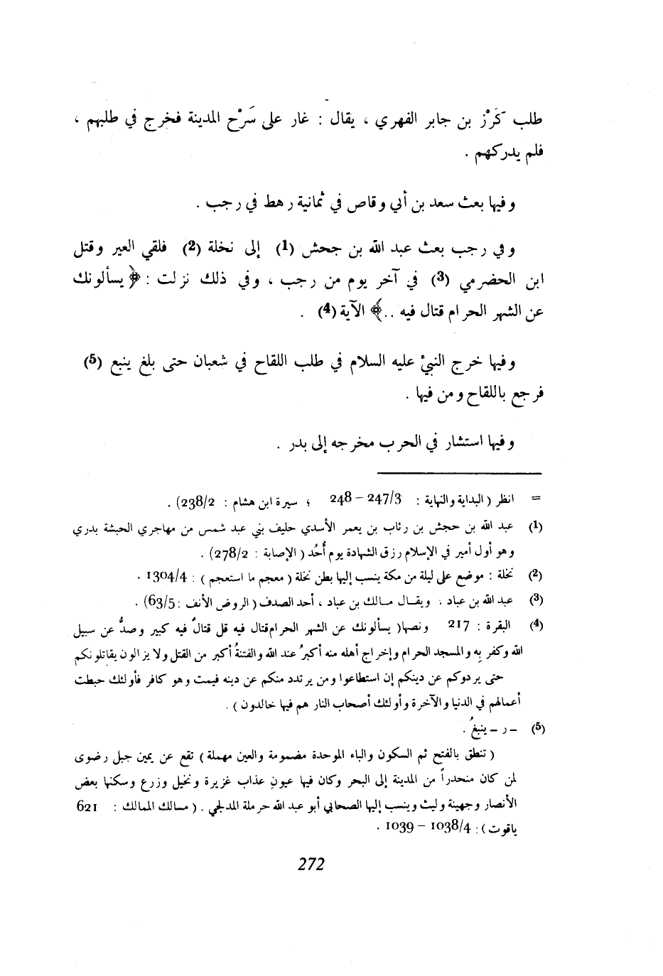 وفي رجب بعث عبد الله بن جحش إلى نخلة فلقي العير وقتل ابن الخضرمي في آخر يوم من رجب، وفي ذلك نزلت: {يَسْأَلُونَكَ عَنِ الشَّهْرِ الْحَرَامِ قِتَالٍ فِيهِ} [البقرة: 217].