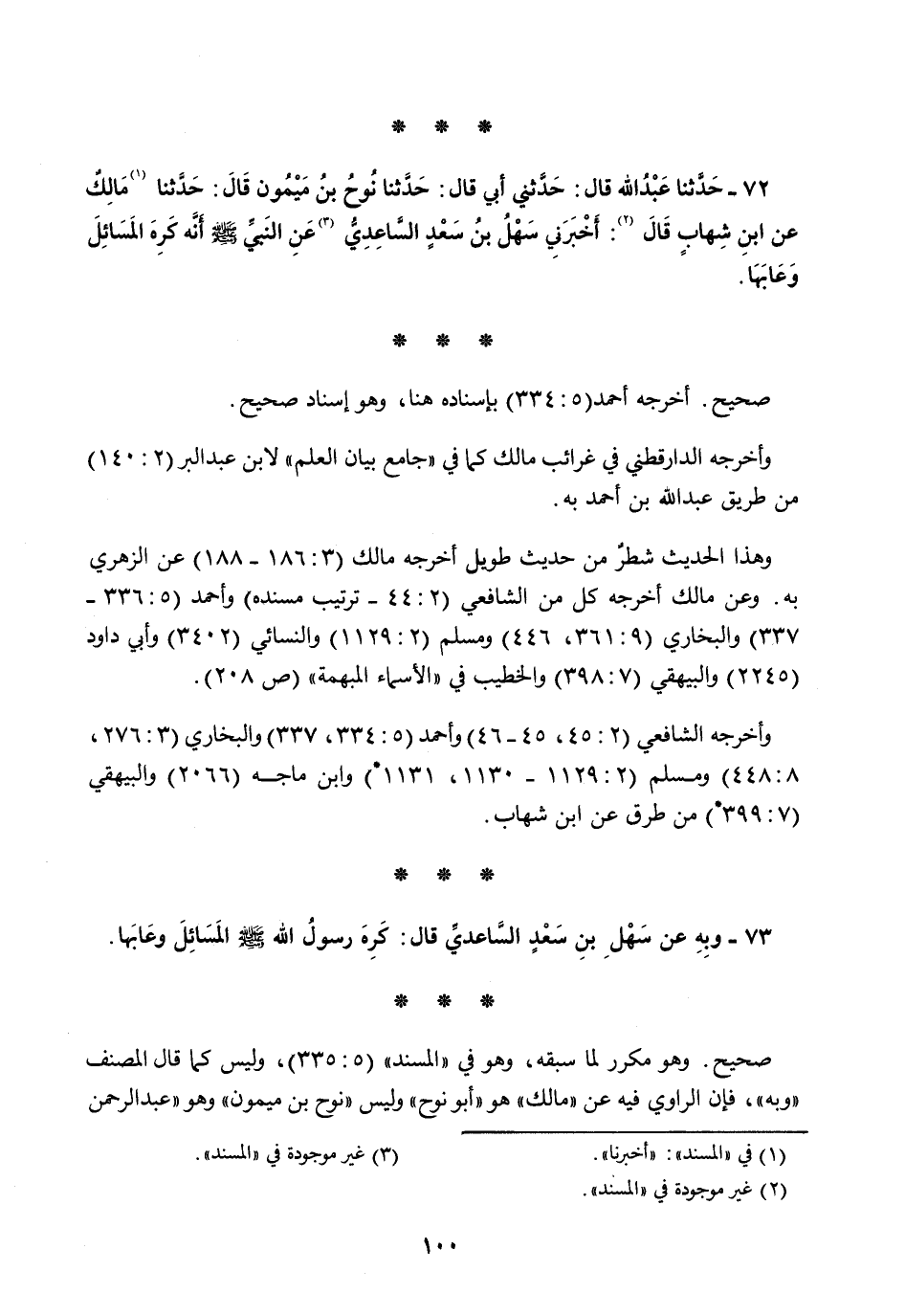 73 - وَبِهِ عَنْ سَهْلِ بْنِ سَعْدٍ السَّاعِدِيِّ قَالَ: §كَرِهَ رَسُولُ اللَّهِ صَلَّى اللهُ عَلَيْهِ وَسَلَّمَ الْمَسَائِلَ وَعَابَهَا