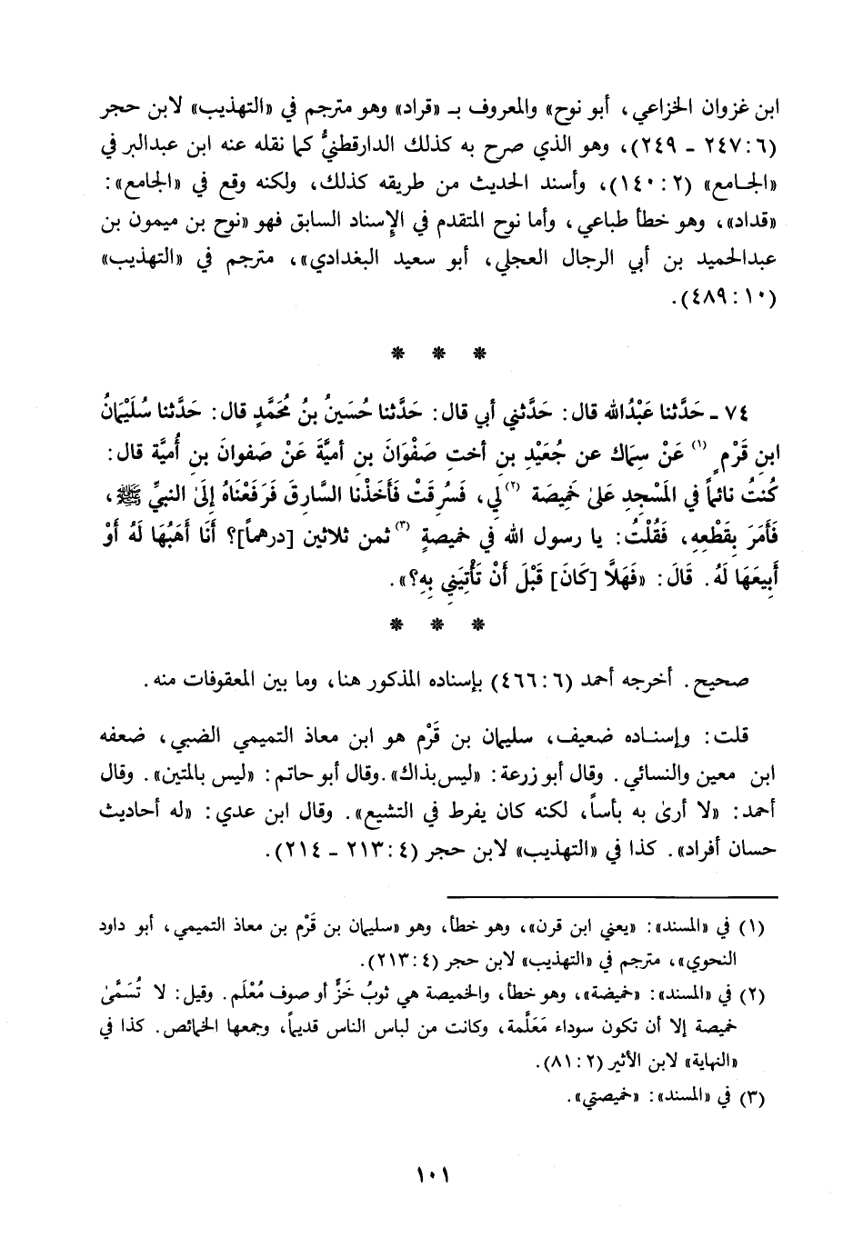 74 - حَدَّثَنَا عَبْدُ اللَّهِ قَالَ: حَدَّثَنِي أَبِي قَالَ: حَدَّثَنَا حُسَيْنُ بْنُ مُحَمَّدٍ قَالَ: حَدَّثَنَا سُلَيْمَانُ بْنُ قَرْمٍ، عَنْ سِمَاكٍ، عَنْ جُعَيْدِ ابْنِ أُخْتِ صَفْوَانَ بْنِ أُمَيَّةَ عَنْ صَفْوَانَ بْنِ أُمَيَّةَ قَالَ: كُنْتُ نَائِمًا فِي الْمَسْجِدِ عَلَى خَمِيصَةٍ لِي فَسُرِقَتْ فَأَخَذْنَا السَّارِقَ فَرَفَعْنَاهُ إِلَى النَّبِيِّ صَلَّى اللهُ عَلَيْهِ وَسَلَّمَ فَأَمَرَ بِقَطْعِهِ فَقُلْتُ يَا رَسُولَ اللَّهِ فِي خَمِيصَةٍ ثَمَنُ ثَلَاثِينَ دِرْهَمًا أَنَا أَهَبُهَا لَهُ أَوْ أَبِيعُهَا لَهُ قَالَ: §«فَهَلَّا كَانَ قَبْلَ أَنْ تَأْتِيَنِي بِهِ»