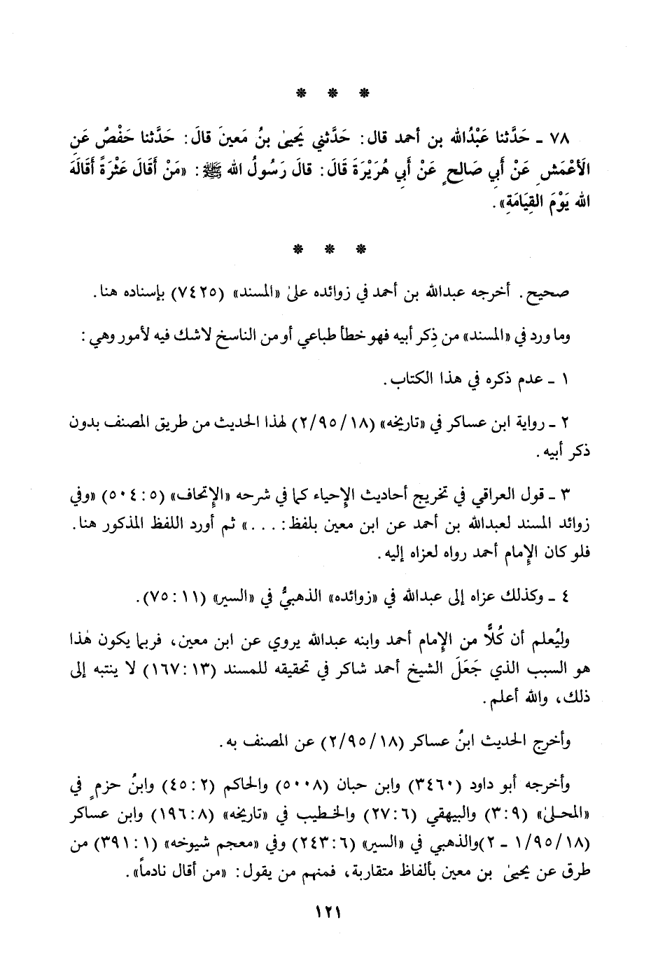 78 - حَدَّثَنَا عَبْدُ اللَّهِ بْنُ أَحْمَدَ قَالَ: حَدَّثَنِي يَحْيَى بْنُ مَعِينٍ قَالَ: حَدَّثَنَا حَفْصٌ، عَنِ الْأَعْمَشِ، عَنْ أَبِي صَالِحٍ، عَنْ أَبِي هُرَيْرَةَ قَالَ: قَالَ رَسُولُ اللَّهِ صَلَّى اللهُ عَلَيْهِ وَسَلَّمَ: §«مَنْ أَقَالَ عَثْرَةً أَقَالَهُ اللَّهُ يَوْمَ الْقِيَامَةِ»