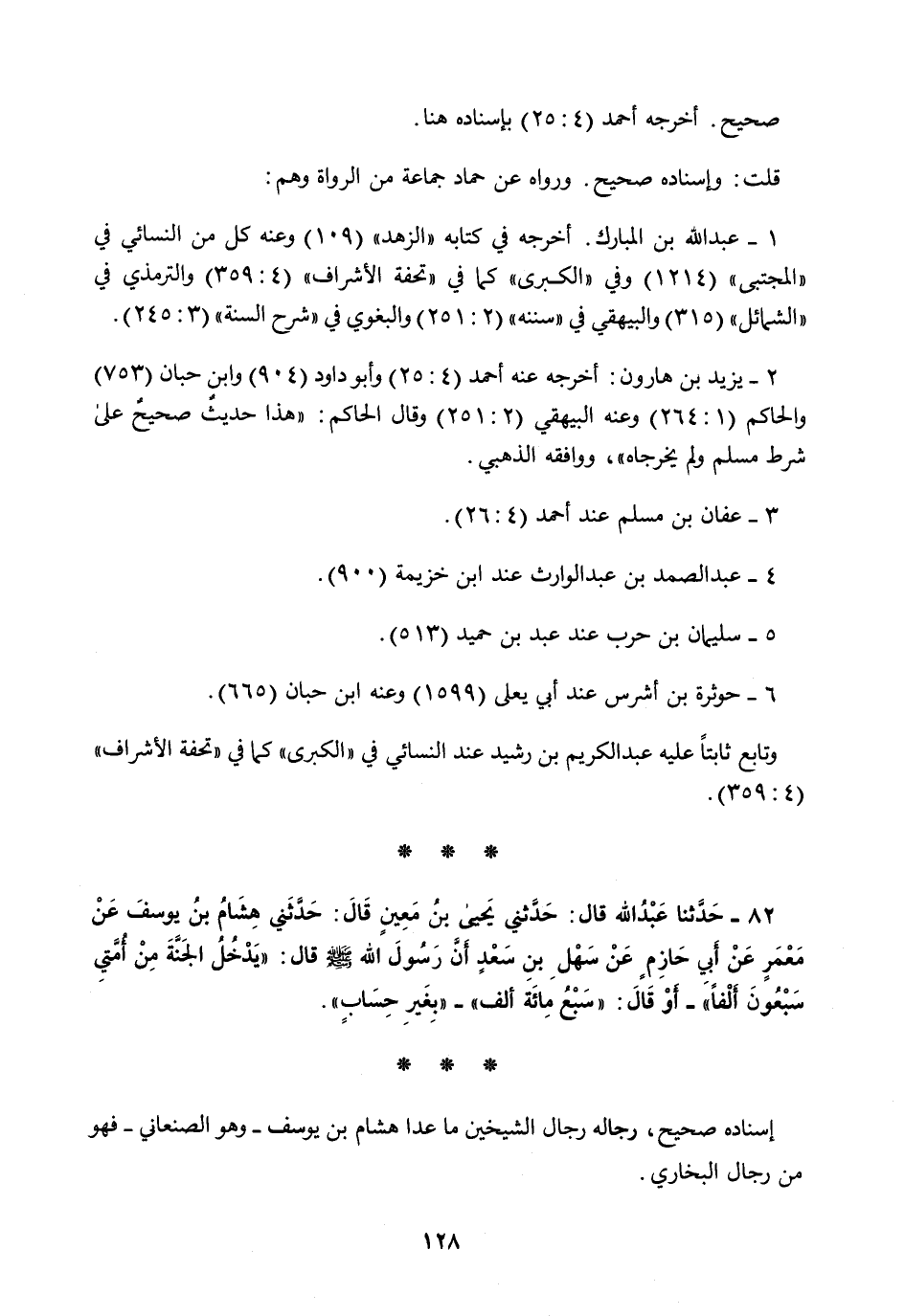 82 - حَدَّثَنَا عَبْدُ اللَّهِ قَالَ: حَدَّثَنِي يَحْيَى بْنُ مَعِينٍ قَالَ: حَدَّثَنِي هِشَامُ بْنُ يُوسُفَ، عَنْ مَعْمَرٍ، عَنْ أَبِي حَازِمٍ، عَنْ سَهْلِ بْنِ سَعْدٍ، أَنَّ رَسُولَ اللَّهِ صَلَّى اللهُ عَلَيْهِ وَسَلَّمَ قَالَ: §«يَدْخُلُ الْجَنَّةَ مِنْ أُمَّتِي سَبْعُونَ أَلْفًا أَوْ قَالَ سَبْعُ مِائَةِ أَلْفٍ بِغَيْرِ حِسَابٍ»