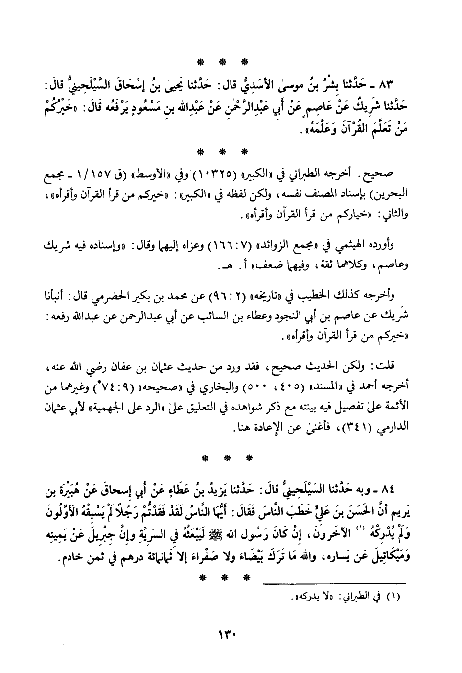 83 - حَدَّثَنَا بِشْرُ بْنُ مُوسَى الْأَسَدِيُّ قَالَ: حَدَّثَنَا يَحْيَى بْنُ إِسْحَاقَ السَّيْلَحِينِيُّ قَالَ: حَدَّثَنَا شَرِيكٌ، عَنْ عَاصِمٍ، عَنْ أَبِي عَبْدِ الرَّحْمَنِ، عَنْ عَبْدِ اللَّهِ بْنِ مَسْعُودٍ، يَرْفَعْهُ قَالَ: §«خَيْرُكُمْ مَنْ تَعَلَّمَ الْقُرْآنَ وَعَلَّمَهُ»