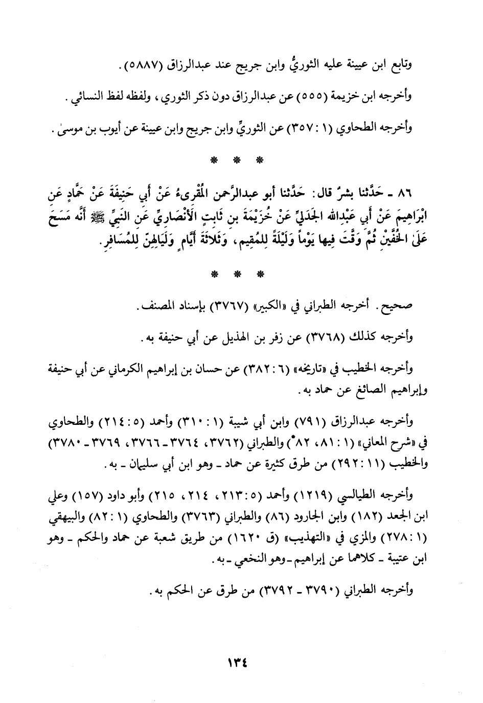 86 - حَدَّثَنَا بِشْرٌ قَالَ: حَدَّثَنَا أَبُو عَبْدِ الرَّحْمَنِ الْمُقْرِئُ، عَنْ أَبِي حَنِيفَةَ، عَنْ حَمَّادٍ، عَنْ إِبْرَاهِيمَ، عَنْ أَبِي عَبْدِ اللَّهِ الْجَدَلِيِّ، عَنْ خُزَيْمَةَ بْنِ ثَابِتٍ الْأَنْصَارِيِّ، عَنِ النَّبِيِّ صَلَّى اللهُ عَلَيْهِ وَسَلَّمَ: §«أَنَّهُ مَسَحَ عَلَى الْخُفَّيْنِ، ثُمَّ وَقَّتَ فِيهَا يَوْمًا وَلَيْلَةً لِلْمُقِيمِ، وَثَلَاثَةَ أَيَّامٍ وَلَيَالِهِنَّ لِلْمُسَافِرِ»