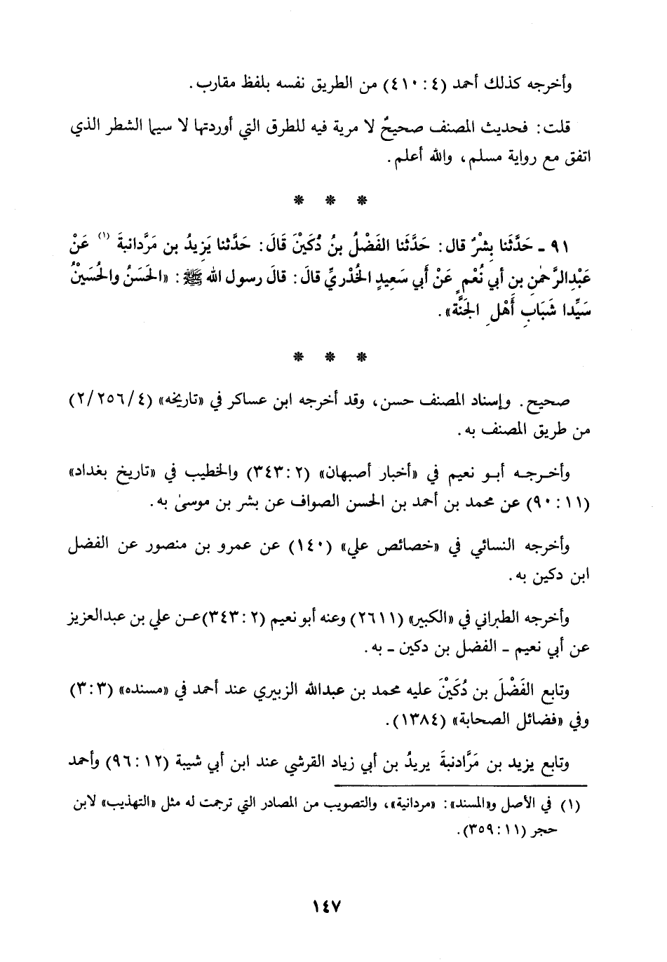 91 - حَدَّثَنَا بِشْرٌ قَالَ: حَدَّثَنَا الْفَضْلُ بْنُ دُكَيْنٍ قَالَ: حَدَّثَنَا يَزِيدُ بْنُ مَرْدَانُبَةَ، عَنْ عَبْدِ الرَّحْمَنِ بْنِ أَبِي نُعْمٍ، عَنْ أَبِي سَعِيدٍ الْخُدْرِيُّ قَالَ: قَالَ رَسُولُ اللَّهِ صَلَّى اللهُ عَلَيْهِ وَسَلَّمَ: §«الْحَسَنُ وَالْحُسَيْنُ سَيِّدَا شَبَابِ أَهْلِ الْجَنَّةِ»