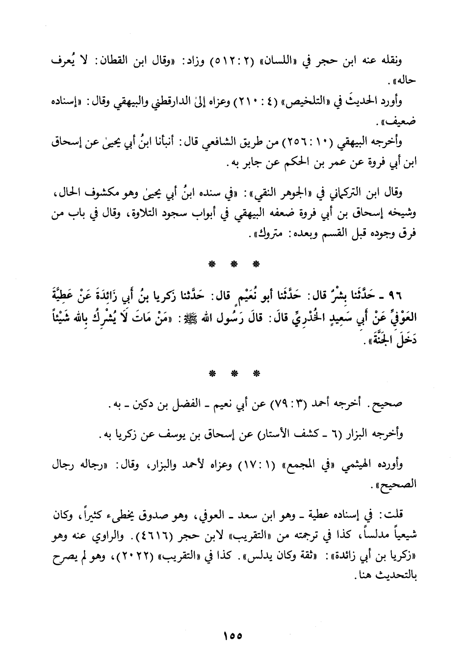 96 - حَدَّثَنَا بِشْرٌ قَالَ: حَدَّثَنَا أَبُو نُعَيْمٍ قَالَ: حَدَّثَنَا زَكَرِيَّا بْنُ أَبِي زَائِدَةَ، عَنْ عَطِيَّةَ الْعَوْفِيِّ، عَنْ أَبِي سَعِيدٍ الْخُدْرِيِّ قَالَ: قَالَ رَسُولُ اللَّهِ صَلَّى اللهُ عَلَيْهِ وَسَلَّمَ: §«مَنْ مَاتَ لَا يُشْرِكْ بِاللَّهِ شَيْئًا دَخَلَ الْجَنَّةَ»