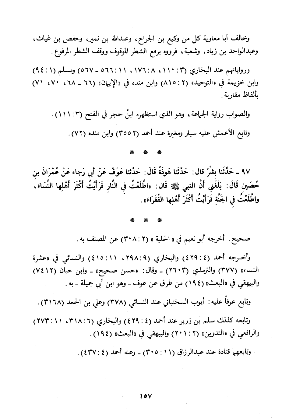 97 - حَدَّثَنَا بِشْرٌ قَالَ: حَدَّثَنَا هَوْذَةُ قَالَ: حَدَّثَنَا عَوْفٌ، عَنْ أَبِي رَجَاءٍ، عَنْ عِمْرَانَ بْنِ حُصَيْنٍ قَالَ: بَلَغَنِي أَنَّ النَّبِيَّ صَلَّى اللهُ عَلَيْهِ وَسَلَّمَ قَالَ: «§اطَّلَعْتُ فِي النَّارِ فَرَأَيْتُ أَكْثَرَ أَهْلِهَا النِّسَاءَ، وَاطَّلَعْتُ فِي الْجَنَّةِ فَرَأَيْتُ أَكْثَرَ أَهْلِهَا الْفُقَرَاءَ»