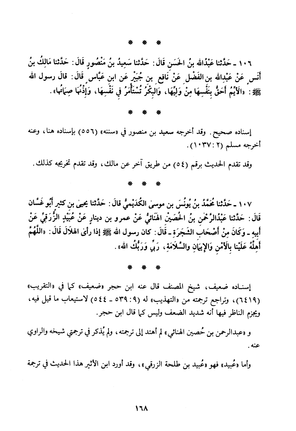 106 - حَدَّثَنَا عَبْدُ اللَّهِ بْنُ الْحَسَنِ قَالَ: حَدَّثَنَا سَعِيدُ بْنُ مَنْصُورٍ قَالَ: حَدَّثَنَا مَالِكُ بْنُ أَنَسٍ، عَنْ عَبْدِ اللَّهِ بْنِ الْفَضْلِ، عَنْ نَافِعِ بْنِ جُبَيْرٍ، عَنِ ابْنِ عَبَّاسٍ قَالَ: قَالَ رَسُولُ اللَّهِ صَلَّى اللهُ عَلَيْهِ وَسَلَّمَ: §«الْأَيِّمُ أَحَقُّ بِنَفْسِهَا مِنْ وَلِيِّهَا، وَالْبِكْرُ تُسْتَأْمَرُ فِي نَفْسِهَا وَإِذْنُهَا صُمَاتُهَا»
