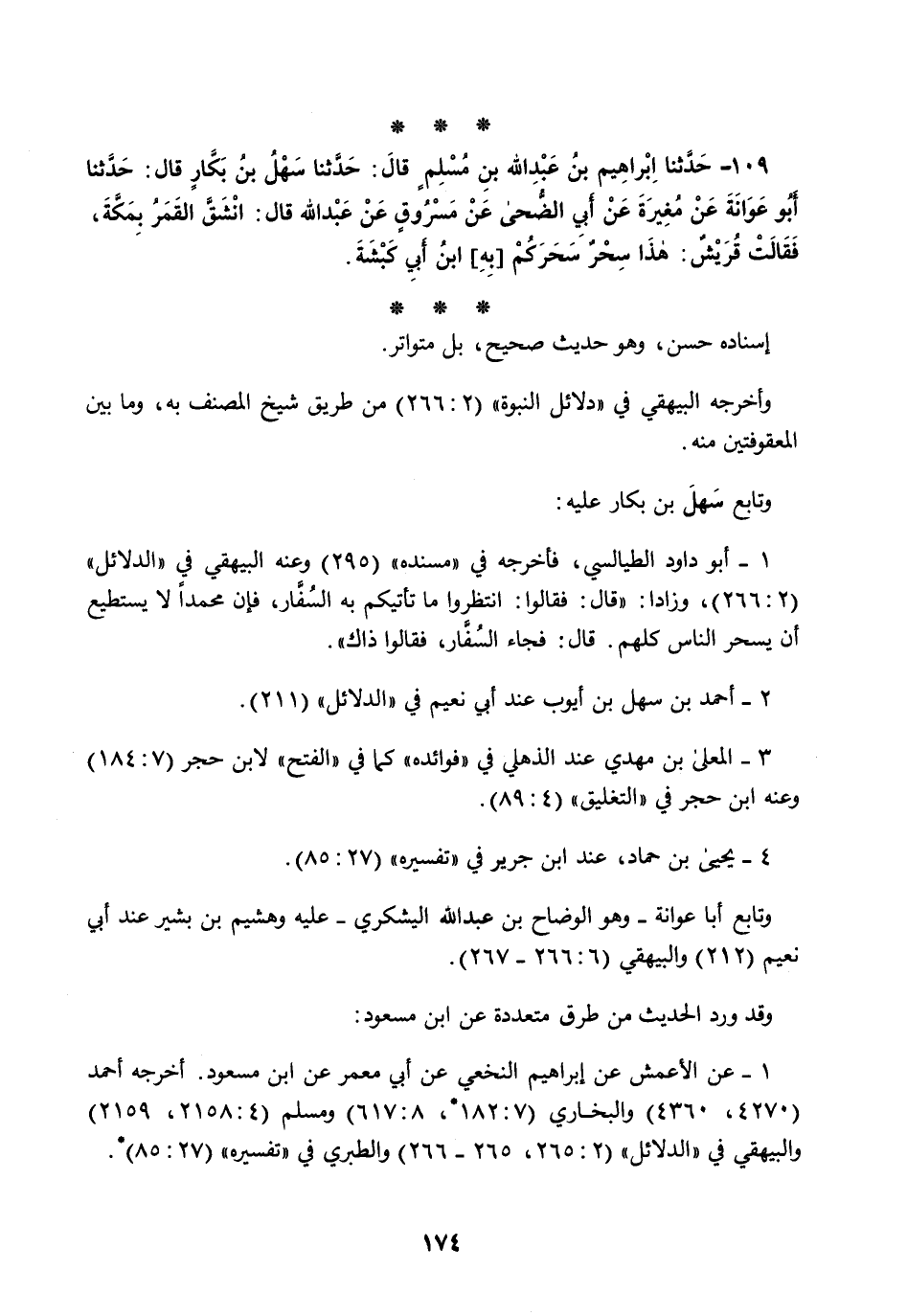 109 - حَدَّثَنَا إِبْرَاهِيمُ بْنُ عَبْدِ اللَّهِ بْنِ مُسْلِمٍ قَالَ: حَدَّثَنَا سَهْلُ بْنُ بَكَّارٍ قَالَ: حَدَّثَنَا أَبُو عَوَانَةَ، عَنْ مُغِيرَةَ، عَنْ أَبِي الضُّحَى، عَنْ مَسْرُوقٍ، عَنْ عَبْدِ اللَّهِ قَالَ: §انْشَقَّ الْقَمَرُ بِمَكَّةَ فَقَالَتْ قُرَيْشٌ: هَذَا سِحْرٌ سَحَرَكُمْ بِهِ ابْنُ أَبِي كَبْشَةَ "
