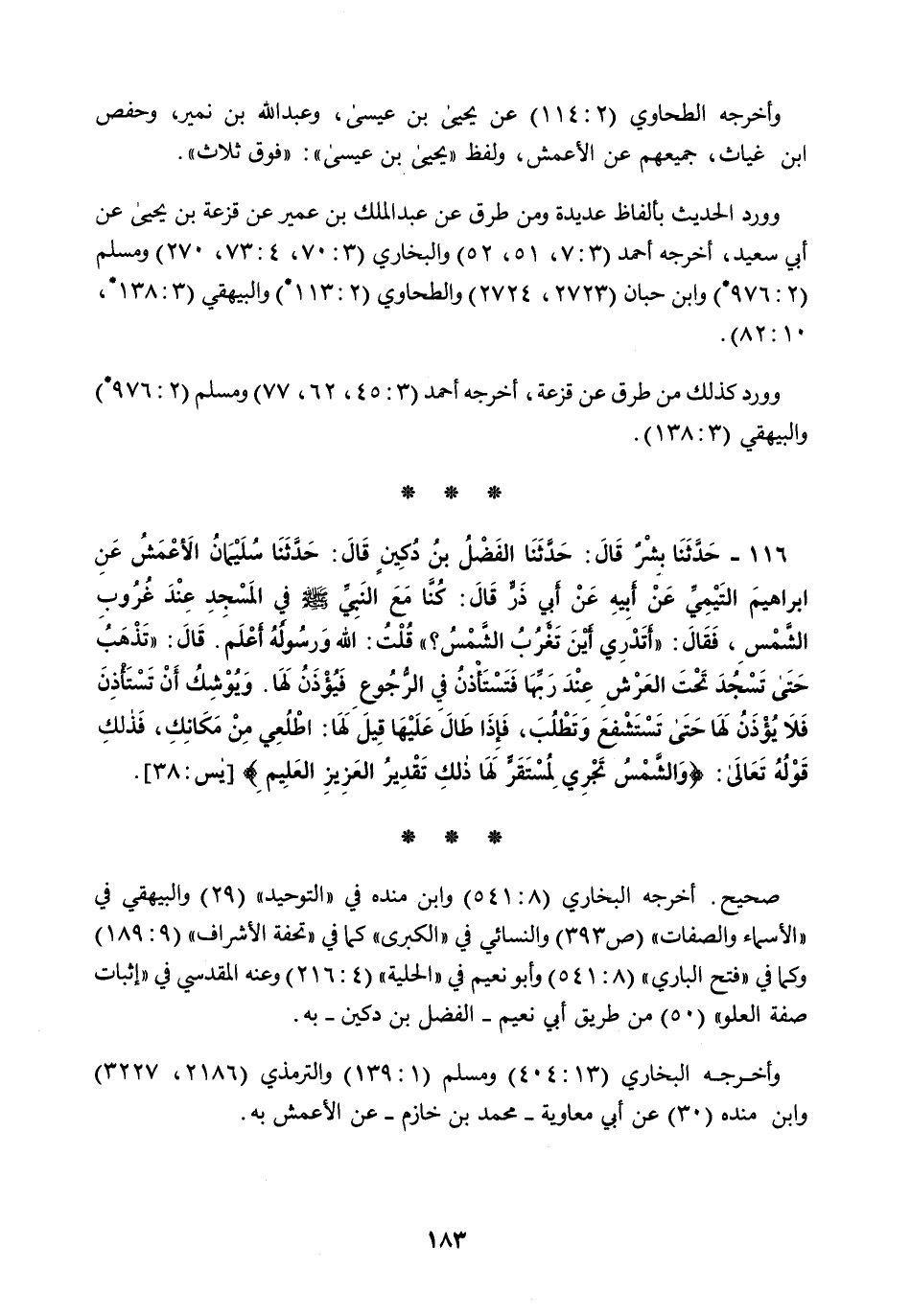 116 - حَدَّثَنَا بِشْرٌ قَالَ: حَدَّثَنَا الْفَضْلُ بْنُ دُكَيْنٍ قَالَ: حَدَّثَنَا سُلَيْمَانُ الْأَعْمَشُ، عَنْ إِبْرَاهِيمَ التَّيْمِيِّ، عَنْ أَبِيهِ، عَنْ أَبِي ذَرٍّ قَالَ: كُنَّا مَعَ النَّبِيِّ صَلَّى اللهُ عَلَيْهِ وَسَلَّمَ فِي الْمَسْجِدِ عِنْدَ غُرُوبِ الشَّمْسِ فَقَالَ: «§أَتَدْرِي أَيْنَ تَغْرُبُ الشَّمْسُ؟» قُلْتُ: اللَّهُ وَرَسُولُهُ أَعْلَمُ قَالَ: " تَذْهَبُ حَتَّى تَسْجُدَ تَحْتَ الْعَرْشِ عِنْدَ رَبِّهَا فَتَسْتَأْذِنُ فِي الرُّجُوعِ فَيُؤْذَنُ لَهَا، وَيُوشِكُ أَنْ تَسْتَأْذِنَ فَلَا يُؤْذَنُ لَهَا حَتَّى تَسْتَشْفِعَ وَتَطْلُبُ فَإِذَا طَالَ عَلَيْهَا قِيلَ لَهَا اطْلُعِي مِنْ مَكَانِكِ فَذَلِكَ قَوْلُهُ تَعَالَى: {وَالشَّمْسُ تَجْرِي لِمُسْتَقَرٍّ لَهَا ذَلِكَ تَقْدِيرُ الْعَزِيزِ الْعَلِيمِ} [يس: 38] "