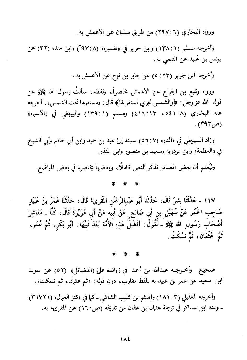 117 - حَدَّثَنَا بِشْرٌ قَالَ: حَدَّثَنَا أَبُو عَبْدِ الرَّحْمَنِ الْمُقْرِئُ قَالَ: حَدَّثَنَا عُمَرُ بْنُ عُبَيْدٍ، صَاحِبُ الْخُمُرِ، عَنْ سُهَيْلِ بْنِ أَبِي صَالِحٍ، عَنْ أَبِيهِ، عَنْ أَبِي هُرَيْرَةَ قَالَ: كُنَّا - مَعَاشِرَ أَصْحَابِ رَسُولِ اللَّهِ صَلَّى اللهُ عَلَيْهِ وَسَلَّمَ - نَقُولُ: «§أَفْضَلُ هَذِهِ الْأُمَّةِ بَعْدَ نَبِيِّهَا أَبُو بَكْرٍ، ثُمَّ عُمَرُ، ثُمَّ عُثْمَانُ ثُمَّ نَسَكْتُ»