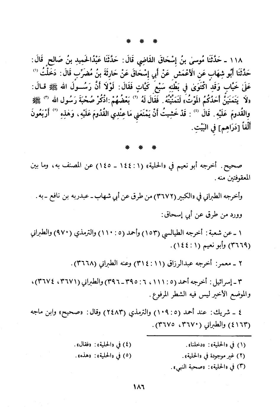 118 - حَدَّثَنَا مُوسَى بْنُ إِسْحَاقَ الْقَاضِي قَالَ: حَدَّثَنَا عَبْدُ الْحَمِيدِ بْنُ صَالِحٍ قَالَ: حَدَّثَنَا أَبُو شِهَابٍ، عَنِ الْأَعْمَشِ، عَنْ أَبِي إِسْحَاقَ، عَنْ حَارِثَةَ بْنِ مُضَرِّبٍ قَالَ: دَخَلْتُ عَلَى خَبَّابٍ وَقَدِ اكْتَوَى فِي بَطْنِهِ سَبْعَ كَيَّاتٍ فَقَالَ: لَوْلَا أَنَّ رَسُولَ اللَّهِ صَلَّى اللهُ عَلَيْهِ وَسَلَّمَ قَالَ: «§لَا يَتَمَنَّيَنَّ أَحَدُكُمُ الْمَوْتَ» لَتَمَنَّيْتُهُ فَقَالَ لَهُ بَعْضُهُمُ: اذْكُرْ صُحْبَةَ رَسُولِ اللَّهِ صَلَّى اللهُ عَلَيْهِ وَسَلَّمَ وَالْقُدُومَ عَلَيْهِ. قَالَ: قَدْ خَشِيتُ أَنْ يَمْنَعَنِيَ مَا عِنْدِي الْقُدُومَ عَلَيْهِ وَهَذِهِ أَرْبَعُونَ أَلْفًا (دَرَاهِمُ) فِي الْبَيْتِ