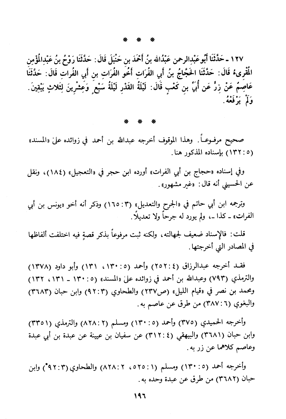 127 - حَدَّثَنَا أَبُو عَبْدِ الرَّحْمَنِ عَبْدُ اللَّهِ بْنُ أَحْمَدَ بْنِ حَنْبَلٍ قَالَ: حَدَّثَنَا رَوْحُ بْنُ عَبْدِ الْمُؤْمِنِ الْمُقْرِئُ قَالَ: حَدَّثَنَا الْحَجَّاجُ بْنُ أَبِي الْفُرَاتِ، أَخُو الْفُرَاتِ بْنِ أَبِي الْفُرَاتِ قَالَ: حَدَّثَنَا عَاصِمٌ، عَنْ زِرٍّ، عَنْ أُبَيِّ بْنِ كَعْبٍ قَالَ: §«لَيْلَةُ الْقَدْرِ لَيْلَةُ سَبْعٍ وَعِشْرِينَ لِثَلَاثٍ يَبْقَيْنَ وَلَمْ يَرْفَعْهُ»