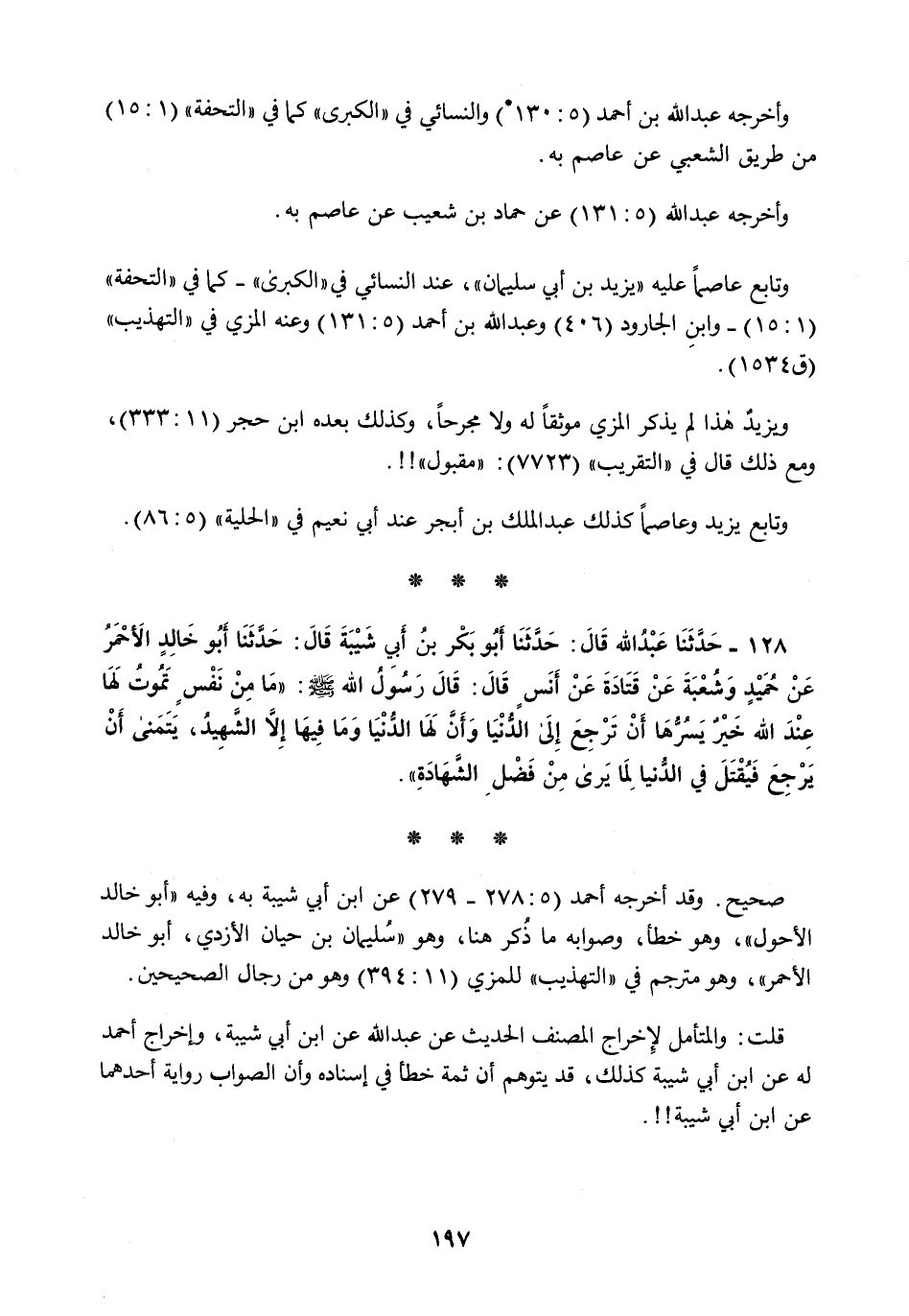 128 - حَدَّثَنَا عَبْدُ اللَّهِ قَالَ: حَدَّثَنَا أَبُو بَكْرِ بْنُ أَبِي شَيْبَةَ قَالَ: حَدَّثَنَا أَبُو خَالِدٍ الْأَحْمَرُ، عَنْ حُمَيْدٍ، وَشُعْبَةَ، عَنْ قَتَادَةَ، عَنْ أَنَسٍ قَالَ: قَالَ رَسُولُ اللَّهِ صَلَّى اللهُ عَلَيْهِ وَسَلَّمَ: §«مَا مِنْ نَفْسٍ تَمُوتُ لَهَا عِنْدَ اللَّهِ خَيْرٌ يَسُرُّهَا أَنْ تَرْجِعَ إِلَى الدُّنْيَا وَأَنَّ لَهَا الدُّنْيَا وَمَا فِيهَا إِلَّا الشَّهِيدُ يَتَمَنَّى أَنْ يَرْجِعَ فَيُقْتَلَ فِي الدُّنْيَا لِمَا يَرَى مِنْ فَضْلِ الشَّهَادَةِ»