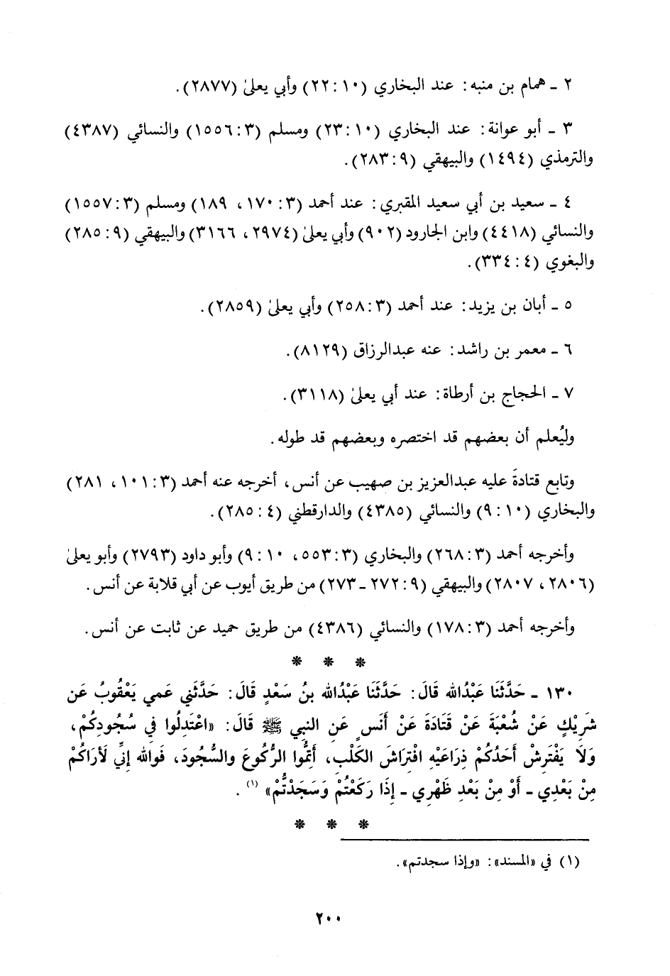130 - حَدَّثَنَا عَبْدُ اللَّهِ قَالَ: حَدَّثَنَا عَبْدُ اللَّهِ بْنُ سَعْدٍ قَالَ: حَدَّثَنِي عَمِّي يَعْقُوبُ عَنْ شَرِيكٍ، عَنْ شُعْبَةَ، عَنْ قَتَادَةَ، عَنْ أَنَسٍ، عَنِ النَّبِيِّ صَلَّى اللهُ عَلَيْهِ وَسَلَّمَ قَالَ: §«اعْتَدِلُوا فِي سُجُودِكُمْ وَلَا يَفْتَرِشُ أَحَدُكُمْ ذِرَاعَيْهِ افْتِرَاشَ الْكَلْبِ أَتِمُّوا الرُّكُوعَ وَالسُّجُودَ فَوَاللَّهِ إِنِّي لَأَرَاكُمْ مِنْ بَعْدِي - أَوْ مِنْ بَعْدِ ظَهْرِي - إِذَا رَكَعْتُمْ وَسَجَدْتُمْ»