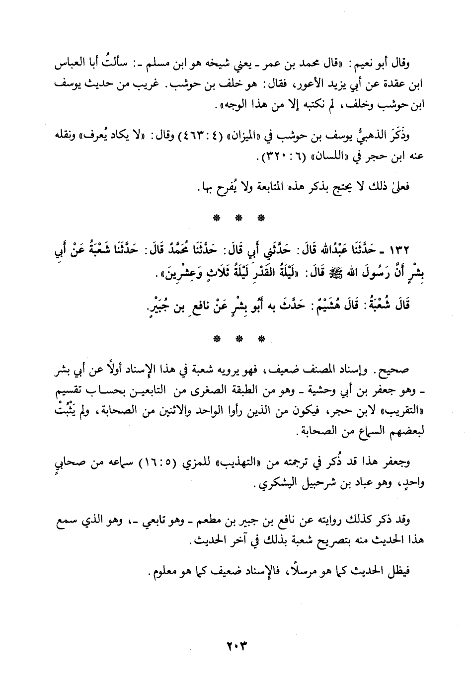 132 - حَدَّثَنَا عَبْدُ اللَّهِ قَالَ: حَدَّثَنِي أَبِي قَالَ: حَدَّثَنَا مُحَمَّدٌ قَالَ: حَدَّثَنَا شُعْبَةُ، عَنْ أَبِي بِشْرٍ، أَنَّ رَسُولَ اللَّهِ صَلَّى اللهُ عَلَيْهِ وَسَلَّمَ قَالَ: «§لَيْلَةُ الْقَدْرِ لَيْلَةُ ثَلَاثٍ وَعِشْرِينَ» قَالَ شُعْبَةُ: قَالَ هُشَيْمٌ: حَدَّثَ بِهِ أَبُو بِشْرٍ عَنْ نَافِعِ بْنِ جُبَيْرٍ