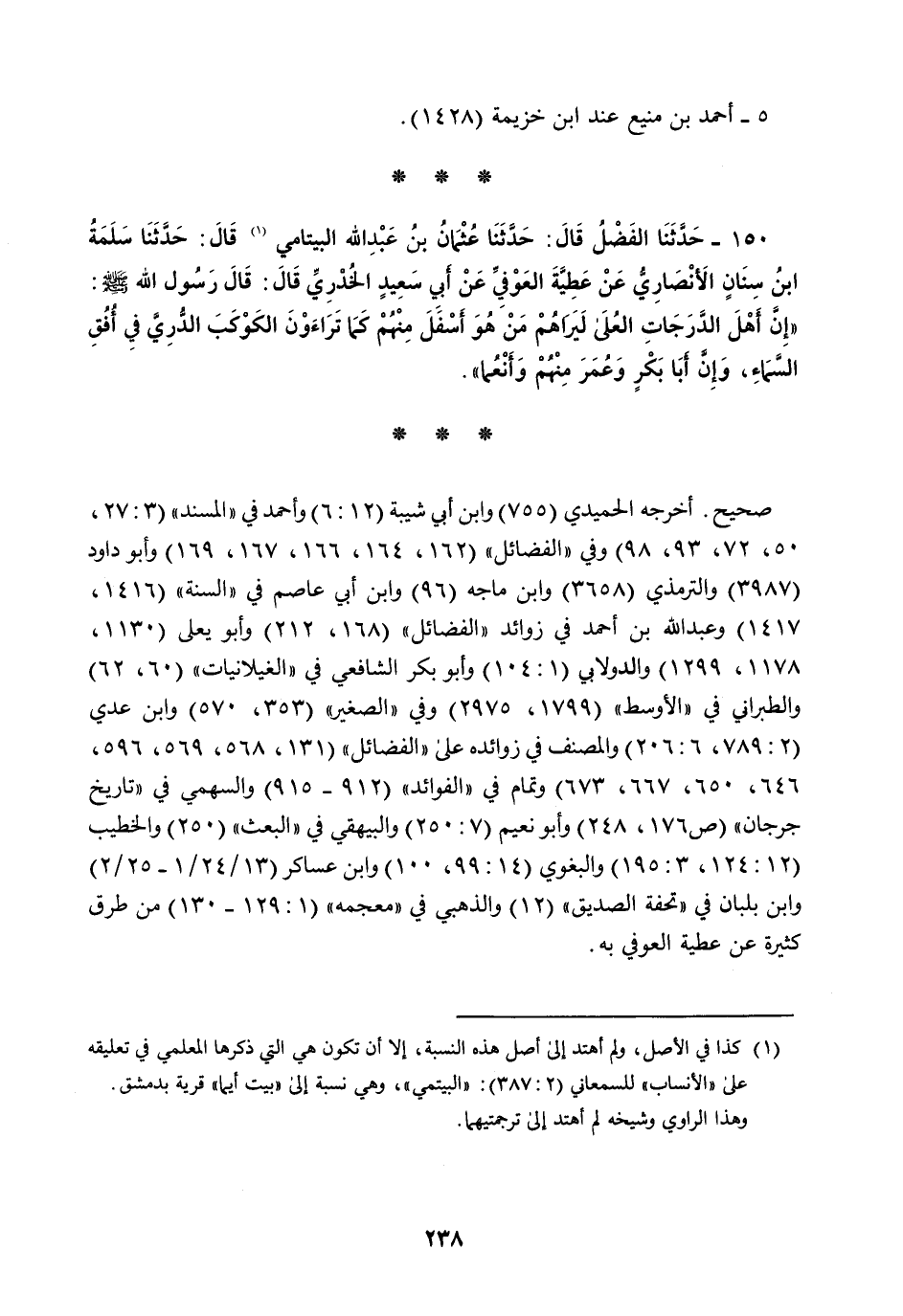 150 - حَدَّثَنَا الْفَضْلُ قَالَ: حَدَّثَنَا عُثْمَانُ بْنُ عَبْدِ اللَّهِ الْبَيْتَامِيُّ قَالَ: حَدَّثَنَا سَلَمَةُ بْنُ سِنَانٍ الْأَنْصَارِيُّ، عَنْ عَطِيَّةَ الْعَوْفِيِّ، عَنْ أَبِي سَعِيدٍ الْخُدْرِيِّ قَالَ: قَالَ رَسُولُ اللَّهِ صَلَّى اللهُ عَلَيْهِ وَسَلَّمَ: §" إِنَّ أَهْلَ الدَّرَجَاتِ الْعُلَى لَيَرَاهُمْ مَنْ هُوَ أَسْفَلَ مِنْهُمْ كَمَا تَرَاءَوْنَ الْكَوْكَبَ الدُّرِّيَّ فِي أُفُقِ السَّمَاءِ وَإِنَّ أَبَا بَكْرٍ وَعُمَرَ مِنْهُمْ وَأَنْعَمَا