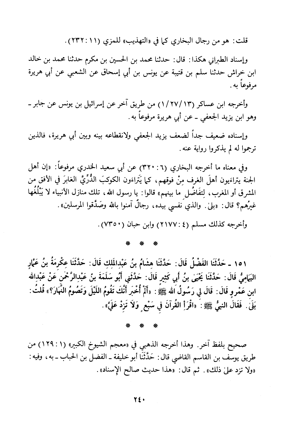 151 - حَدَّثَنَا الْفَضْلُ قَالَ: حَدَّثَنَا هِشَامُ بْنُ عَبْدِ الْمَلِكِ قَالَ: حَدَّثَنَا عِكْرِمَةُ بْنُ عَمَّارٍ الْيَمَامِيُّ قَالَ: حَدَّثَنَا يَحْيَى بْنُ أَبِي كَثِيرٍ قَالَ: حَدَّثَنِي أَبُو سَلَمَةَ بْنُ عَبْدِ الرَّحْمَنِ، عَنْ عَبْدِ اللَّهِ بْنِ عَمْرٍو قَالَ: قَالَ لِي رَسُولُ اللَّهِ صَلَّى اللهُ عَلَيْهِ وَسَلَّمَ: §«أَلَمْ أُخْبَرُ أَنَّكَ تَقُومُ اللَّيْلَ وَتَصُومُ النَّهَارَ؟» قُلْتُ: بَلَى، فَقَالَ النَّبِيُّ صَلَّى اللهُ عَلَيْهِ وَسَلَّمَ: «اقْرَأِ الْقُرْآنَ فِي سَبْعٍ وَلَا تَزِدْ عَلَيَّ»