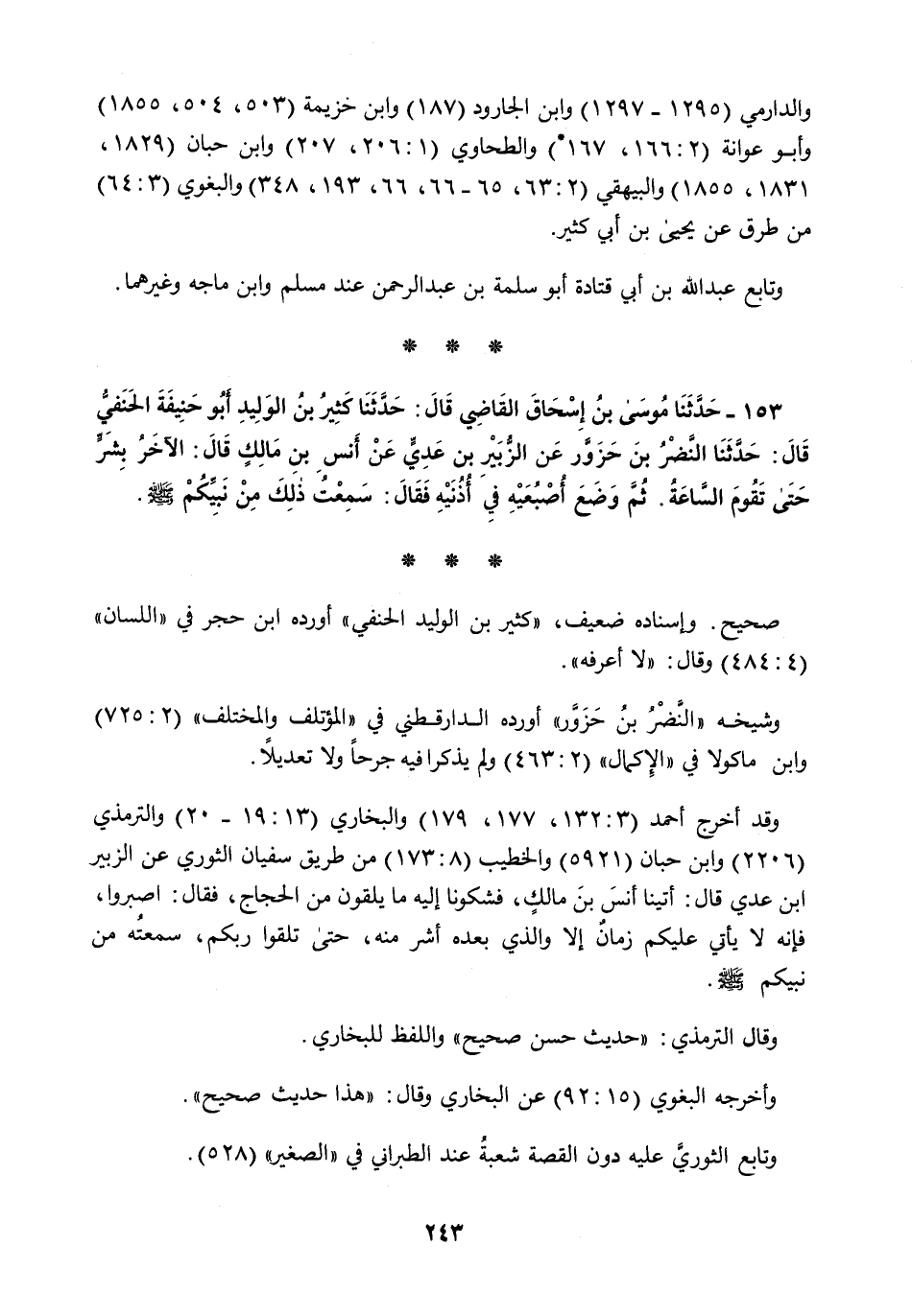 153 - حَدَّثَنَا مُوسَى بْنُ إِسْحَاقَ الْقَاضِي قَالَ: حَدَّثَنَا كَثِيرُ بْنُ الْوَلِيدِ أَبُو حَنِيفَةَ الْحَنَفِيُّ قَالَ: حَدَّثَنَا النَّضْرُ بْنُ حَزَوَّرٍ، عَنِ الزُّبَيْرِ بْنِ عَدِيٍّ، عَنْ أَنَسِ بْنِ مَالِكٍ قَالَ: «§الْآخَرُ بِشَرٍّ حَتَّى تَقُومَ السَّاعَةُ» ، ثُمَّ وَضَعَ أُصْبُعَيْهِ فِي أُذُنَيْهِ فَقَالَ: سَمِعْتُ ذَلِكَ مِنْ نَبِيِّكُمْ صَلَّى اللهُ عَلَيْهِ وَسَلَّمَ