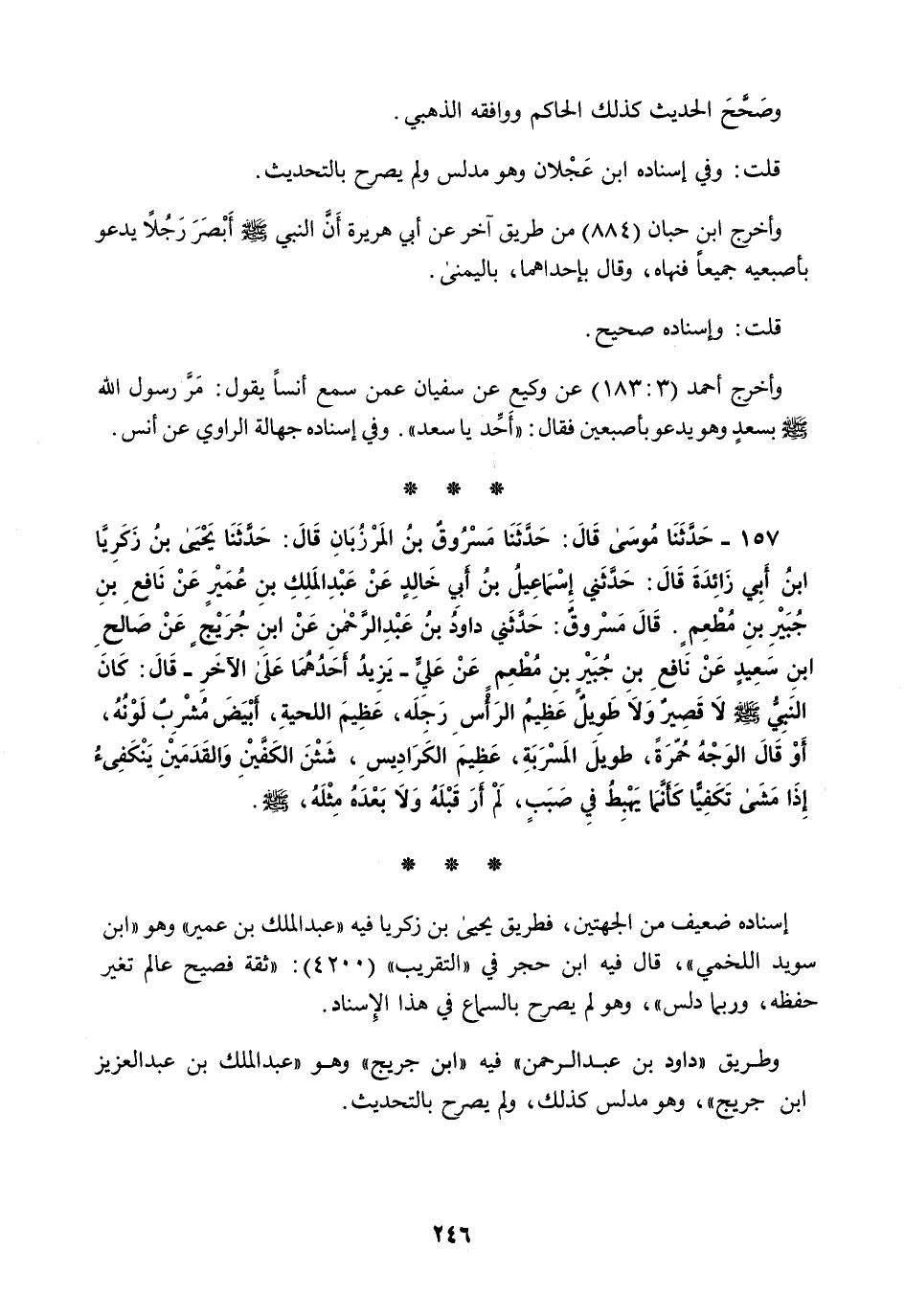 157 - حَدَّثَنَا مُوسَى قَالَ: حَدَّثَنَا مَسْرُوقُ بْنُ الْمَرْزُبَانِ قَالَ: حَدَّثَنَا يَحْيَى بْنُ زَكَرِيَّا بْنِ أَبِي زَائِدَةَ قَالَ: حَدَّثَنِي إِسْمَاعِيلُ بْنُ أَبِي خَالِدٍ، عَنْ عَبْدِ الْمَلِكِ بْنِ عُمَيْرٍ، عَنْ نَافِعِ بْنِ جُبَيْرِ بْنِ مُطْعِمٍ قَالَ مَسْرُوقٌ: حَدَّثَنِي دَاودُ بْنُ عَبْدِ الرَّحْمَنِ، عَنِ ابْنِ جُرَيْجٍ، عَنْ صَالِحِ بْنِ سَعِيدٍ، عَنْ نَافِعِ بْنِ جُبَيْرِ بْنِ مُطْعِمٍ، عَنْ عَلِيٍّ، يَزِيدُ أَحَدُهُمَا عَلَى الْآخَرِ قَالَ: §كَانَ النَّبِيُّ صَلَّى اللهُ عَلَيْهِ وَسَلَّمَ لَا قَصِيرٌ وَلَا طَوِيلٌ عَظِيمُ الرَّأْسِ رَجِلَهُ، عَظِيمَ اللِّحْيَةِ أَبْيَضَ مُشْرَبٌ لَوْنُهُ أَوْ قَالَ الْوَجْهُ حُمْرَةً طَوِيلُ الْمَسْرَبَةِ، عَظِيمُ الْكَرَادِيسِ، شَثْنُ الْكَفَّيْنِ وَالْقَدَمَيْنِ يَنْكَفِئُ إِذَا مَشَى تَكَفِّيًّا كَأَنَّمَا يَهْبِطُ فِي صَبَبٍ، لَمْ أَرَ قَبْلَهُ وَلَا بَعْدَهُ مِثْلَهُ صَلَّى اللهُ عَلَيْهِ وَسَلَّمَ