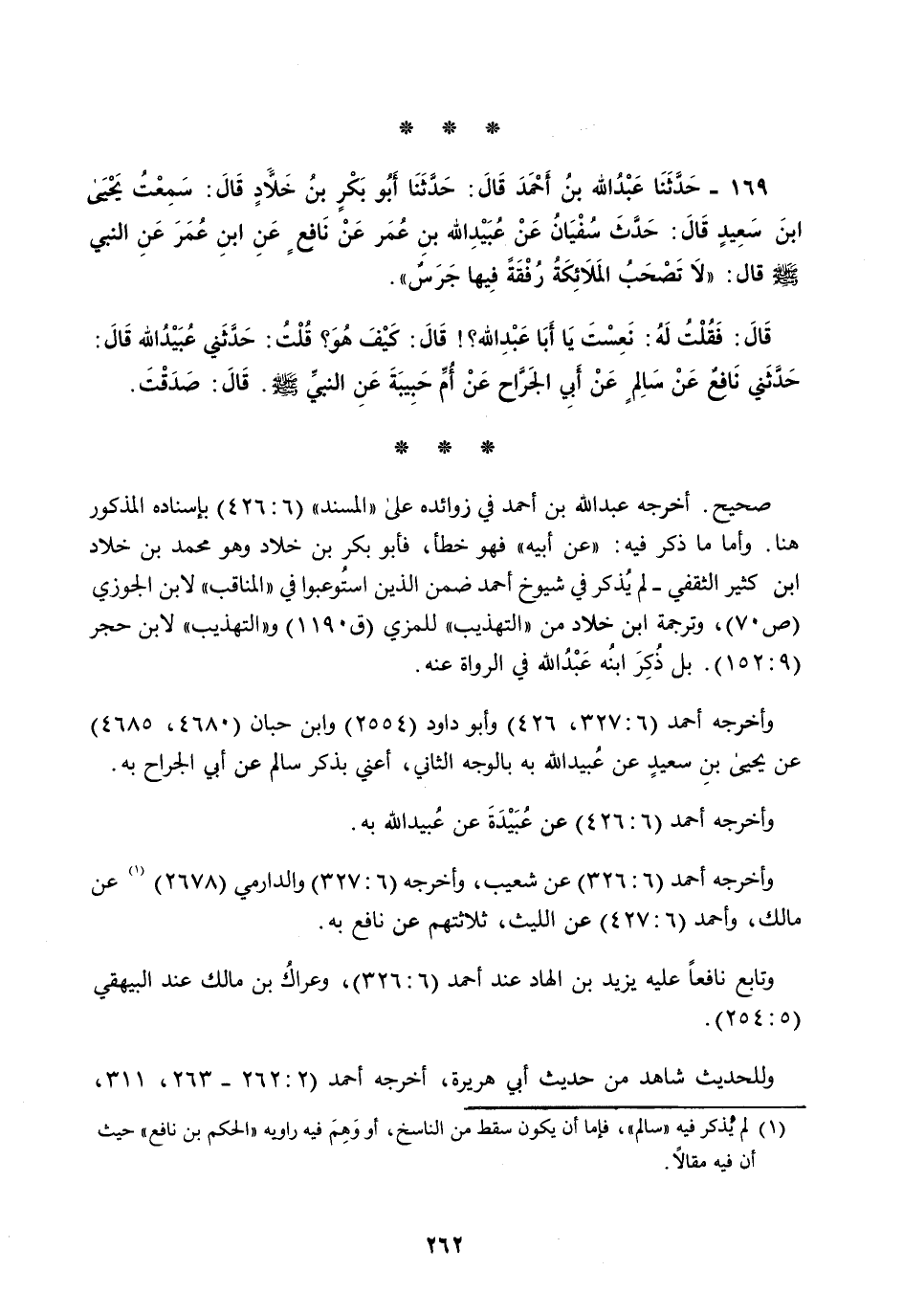 169 - حَدَّثَنَا عَبْدُ اللَّهِ بْنُ أَحْمَدَ قَالَ: حَدَّثَنَا أَبُو بَكْرِ بْنُ خَلَّادٍ قَالَ: سَمِعْتُ يَحْيَى بْنَ سَعِيدٍ قَالَ: حَدَّثَ سُفْيَانُ، عَنْ عُبَيْدِ اللَّهِ بْنِ عُمَرَ، عَنْ نَافِعٍ، عَنِ ابْنِ عُمَرَ، عَنِ النَّبِيِّ صَلَّى اللهُ عَلَيْهِ وَسَلَّمَ قَالَ: «§لَا تَصْحَبُ الْمَلَائِكَةُ رُفْقَةً فِيهَا جَرَسٌ» قَالَ: فَقُلْتُ لَهُ: نَعِسْتَ يَا أَبَا عَبْدِ اللَّهِ؟ قَالَ: كَيْفَ هُوَ؟ قُلْتُ: حَدَّثَنِي عُبَيْدُ اللَّهِ قَالَ: حَدَّثَنِي نَافِعٌ عَنْ سَالِمٍ عَنْ أَبِي الْجَرَّاحِ عَنْ أُمِّ حَبِيبَةَ عَنِ النَّبِيِّ صَلَّى اللهُ عَلَيْهِ وَسَلَّمَ قَالَ: صَدَقْتَ