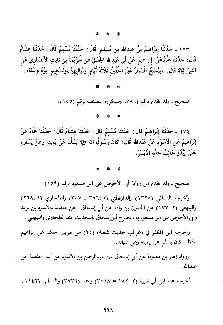 173 - حَدَّثَنَا إِبْرَاهِيمُ بْنُ عَبْدِ اللَّهِ بْنِ مُسْلِمٍ قَالَ: حَدَّثَنَا مُسْلِمٌ قَالَ: حَدَّثَنَا هِشَامٌ قَالَ: حَدَّثَنَا حَمَّادٌ، عَنْ إِبْرَاهِيمَ، عَنْ أَبِي عَبْدِ اللَّهِ الْجَدَلِيِّ، عَنْ خُزَيْمَةَ بْنِ ثَابِتٍ الْأَنْصَارِيِّ، عَنِ النَّبِيِّ صَلَّى اللهُ عَلَيْهِ وَسَلَّمَ قَالَ: " §يَمْسَحُ الْمُسَافِرُ عَلَى الْخُفَّيْنِ ثَلَاثَةَ أَيَّامٍ وَلَيَالِيهِنَّ، وَلِلْمُقِيمِ يَوْمٌ وَلَيْلَةٌ