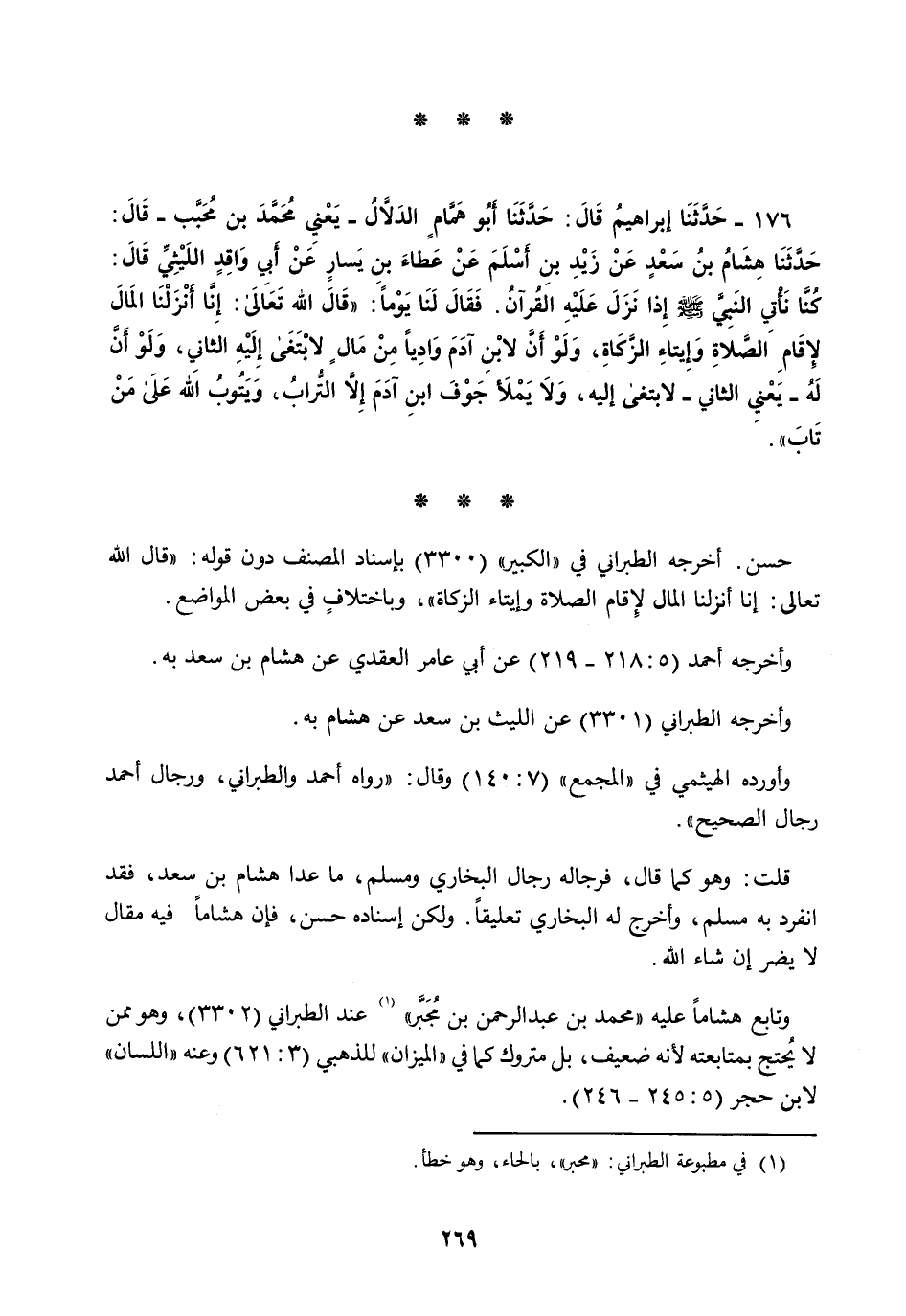 176 - حَدَّثَنَا إِبْرَاهِيمُ قَالَ: حَدَّثَنَا أَبُو هَمَّامٍ الدَّلَّالُ يَعْنِي مُحَمَّدَ بْنَ مُحَبَّبٍ قَالَ: حَدَّثَنَا هِشَامُ بْنُ سَعْدٍ، عَنْ زَيْدِ بْنِ أَسْلَمَ، عَنْ عَطَاءِ بْنِ يَسَارٍ، عَنْ أَبِي وَاقِدٍ اللَّيْثِيِّ قَالَ: §كُنَّا نَأْتِي النَّبِيَّ صَلَّى اللهُ عَلَيْهِ وَسَلَّمَ إِذَا نَزَلَ عَلَيْهِ الْقُرْآنُ فَقَالَ لَنَا يَوْمًا: " قَالَ اللَّهُ تَعَالَى: إِنَّا أَنْزَلْنَا الْمَالَ لِإِقَامِ الصَّلَاةِ، وَإِيتَاءِ الزَّكَاةِ، وَلَوْ أَنَّ لِابْنِ آدَمَ وَادِيًا مِنْ مَالٍ لَابْتَغَى إِلَيْهِ الثَّانِي وَلَوْ أَنَّ لَهُ - يَعْنِي الثَّانِي - لَابْتَغَى إِلَيْهِ، وَلَا يَمْلَأُ جَوْفَ ابْنِ آدَمَ إِلَّا التُّرَابُ وَيَتُوبُ اللَّهُ عَلَى مَنْ تَابَ "