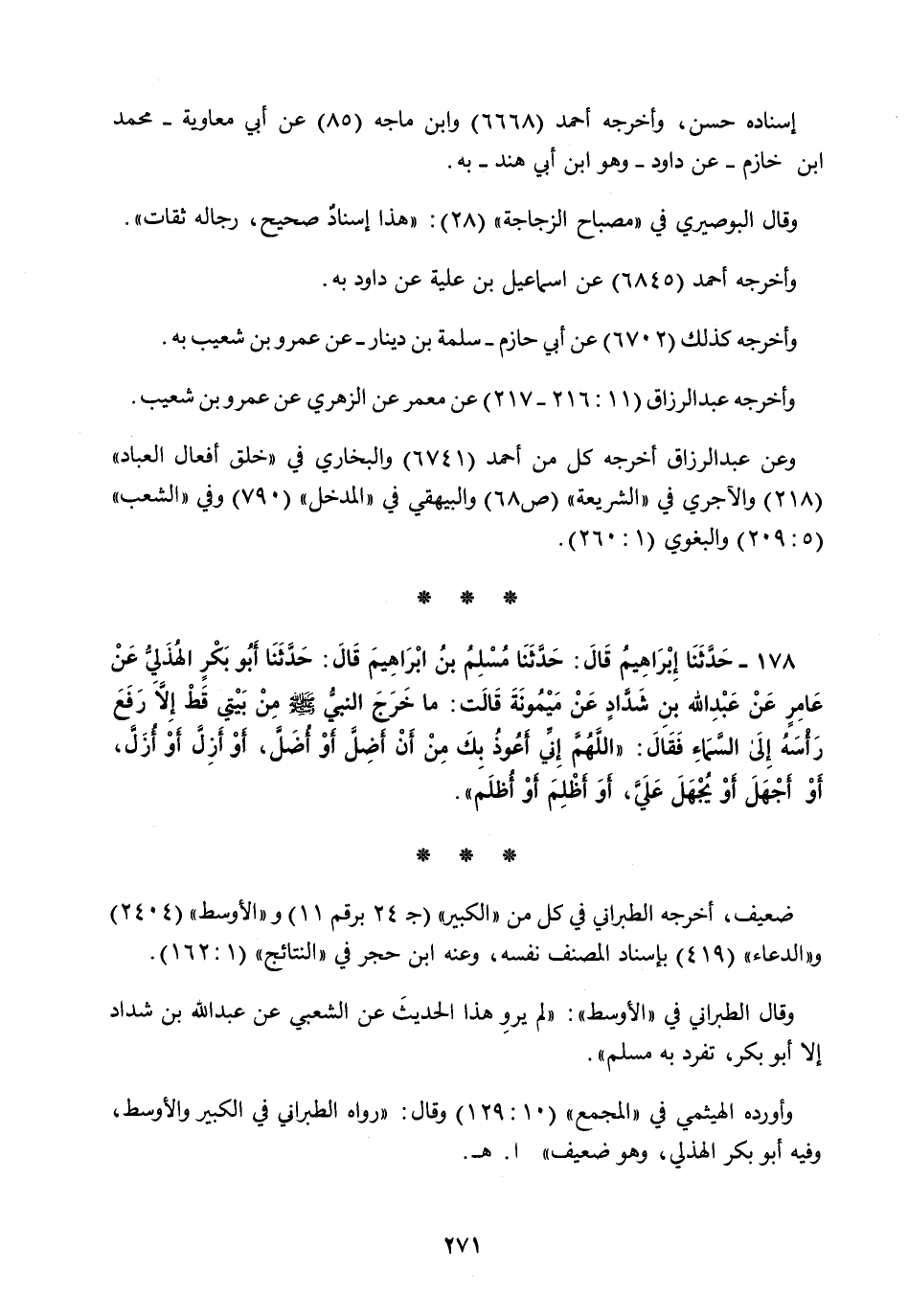178 - حَدَّثَنَا إِبْرَاهِيمُ قَالَ: حَدَّثَنَا مُسْلِمُ بْنُ إِبْرَاهِيمَ قَالَ: حَدَّثَنَا أَبُو بَكْرٍ الْهُذَلِيُّ، عَنْ عَامِرٍ، عَنْ عَبْدِ اللَّهِ بْنِ شَدَّادٍ، عَنْ مَيْمُونَةَ قَالَتْ: مَا خَرَجَ النَّبِيُّ صَلَّى اللهُ عَلَيْهِ وَسَلَّمَ مِنْ بَيْتِي قَطُّ إِلَّا رَفَعَ رَأْسَهُ إِلَى السَّمَاءِ فَقَالَ: «§اللَّهُمَّ إِنِّي أَعُوذُ بِكَ مِنْ أَنْ أَضِلَّ أَوْ أُضَلَّ، أَوْ أَزِلَّ أَوْ أُزَلَّ، أَوْ أَجْهَلَ أَوْ يُجْهَلَ عَلَيَّ، أَوْ أَظْلِمَ أَوْ أُظْلَمَ»